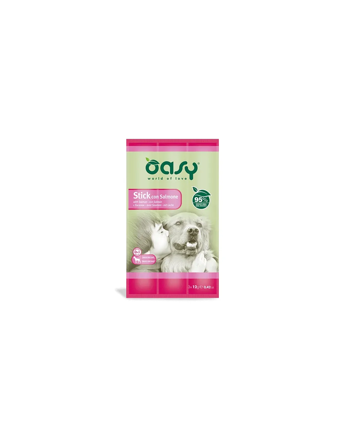 Der Oasy Snack „Stick with Salmon“ ist ein Ergänzungsfuttermittel für Hunde, das sich durch hohe Schmackhaftigkeit und Qualität der Zutaten auszeichnet. Dieser Snack ist für Hunde jeden Alters und jeder Größe geeignet und wurde entwickelt, um den Gaumen unserer vierbeinigen Freunde zu verwöhnen und ein einzigartiges Geschmackserlebnis beim Training oder als Belohnung zu bieten. Es enthält drei Sticks à 12 Gramm, also insgesamt 36 Gramm puren Genuss.