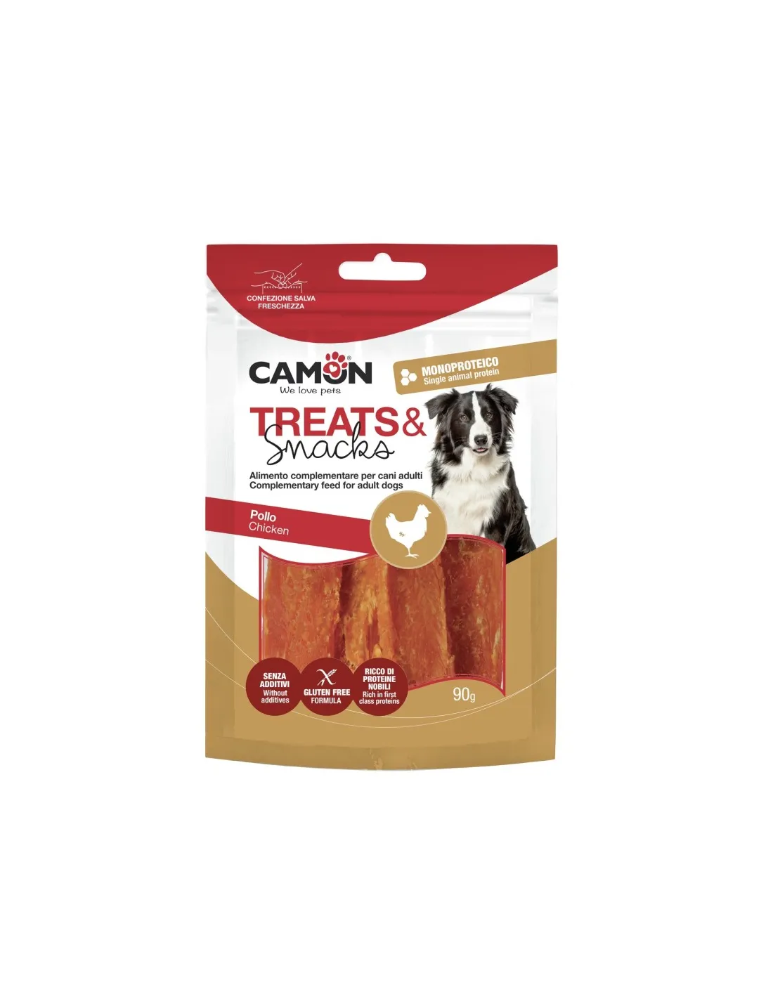 Treats&Snacks Crispy Chicken Pollo ist ein Hundesnack der Marke Camon. Dieser Snack ist zum Kauen konzipiert und frei von Zusatzstoffen. Es besteht zu 86,5 % aus Hühnerfleisch und Hühnerfleischprodukten, Glycerin, Maisstärke und Sorbit. Die Packung enthält 250 Gramm. Dieser Snack ist für Hunde ab 4 Monaten geeignet und kann zu jeder Tageszeit als Leckerli oder Snack verabreicht werden.