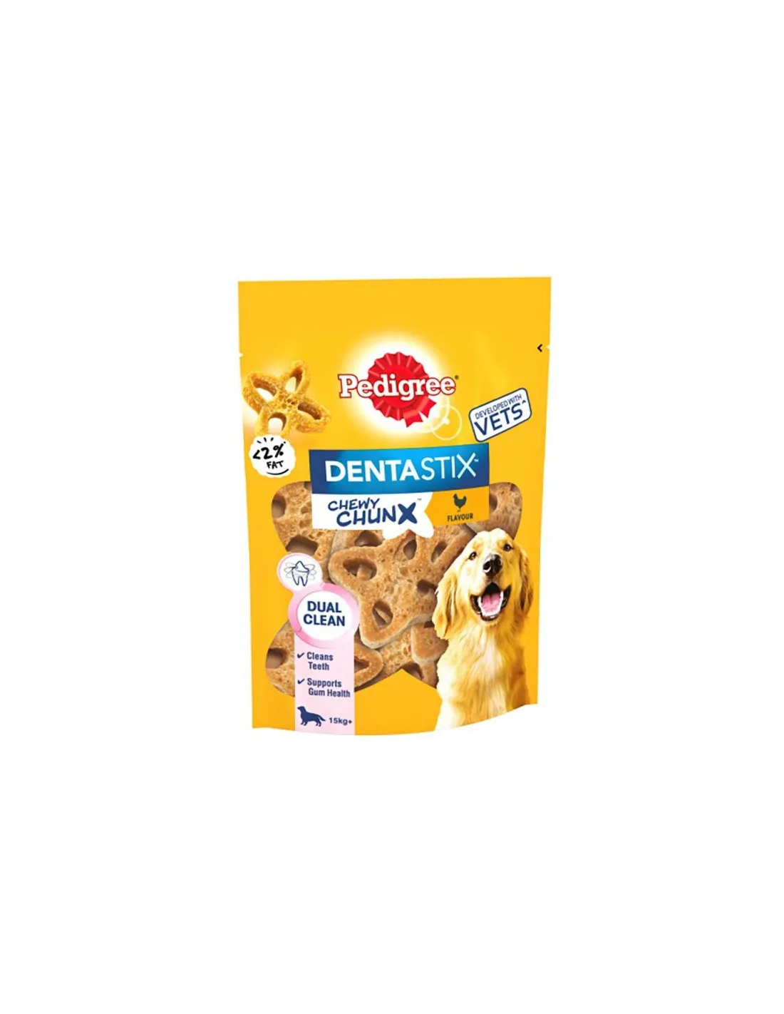 Pedigree Dentastix Chewy Chunx Maxi ist ein Snack für große Hunde (über 15 kg) mit köstlichem Hühnergeschmack. Dieser Snack trägt dank der Wirkstoffe, die beim Kauen zur Reinigung der Zähne beitragen, zur Erhaltung sauberer Zähne und eines gesunden Zahnfleisches bei. Das Gewicht des Produkts beträgt 68 Gramm und der Geschmack ist Hühnchen. Es ist für große Hunde geeignet. Bei dem Produkt handelt es sich um einen Hundesnack namens „Dentastix Chewy Chunk“ der Marke „Dog Snack“.