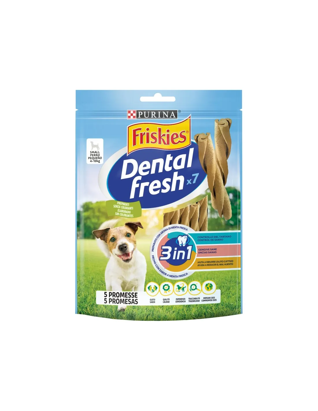 Purina Friskies Dental Fresh Snack Oral and Dental Hygiene ist ein Snack für kleine Hunde, der für die Mund- und Zahnhygiene entwickelt wurde. Das Produkt wird in einer Packung verkauft, die 6 Packungen à 110 Gramm enthält. Dieser Hundesnack hält den Atem frisch und trägt zur Zahngesundheit Ihres Vierbeiners bei.
