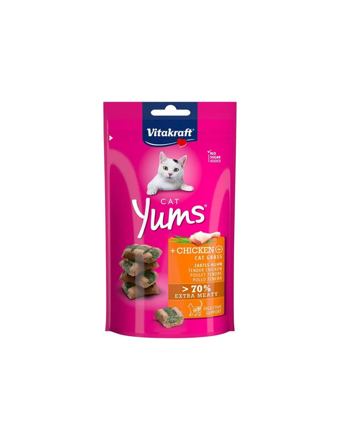 Vitakraft Cat Yums Chicken & Grass ist ein leckerer Snack für Katzen aus Huhn und Gras. Diese weichen Häppchen werden aus den besten Zutaten hergestellt und schonend gebacken, damit alle Eigenschaften erhalten bleiben. Die Packung ist frisch gehalten und verfügt über einen wiederverschließbaren Reißverschluss, ideal zur Erhaltung der Frische des Produkts. Dieser Snack hat einen Fleischanteil von 70 %, hat eine unwiderstehliche Konsistenz und wird sorgfältig im Ofen gegart, sodass die köstliche Füllung weich bleibt und für die Katze ihre volle Saftigkeit behält.