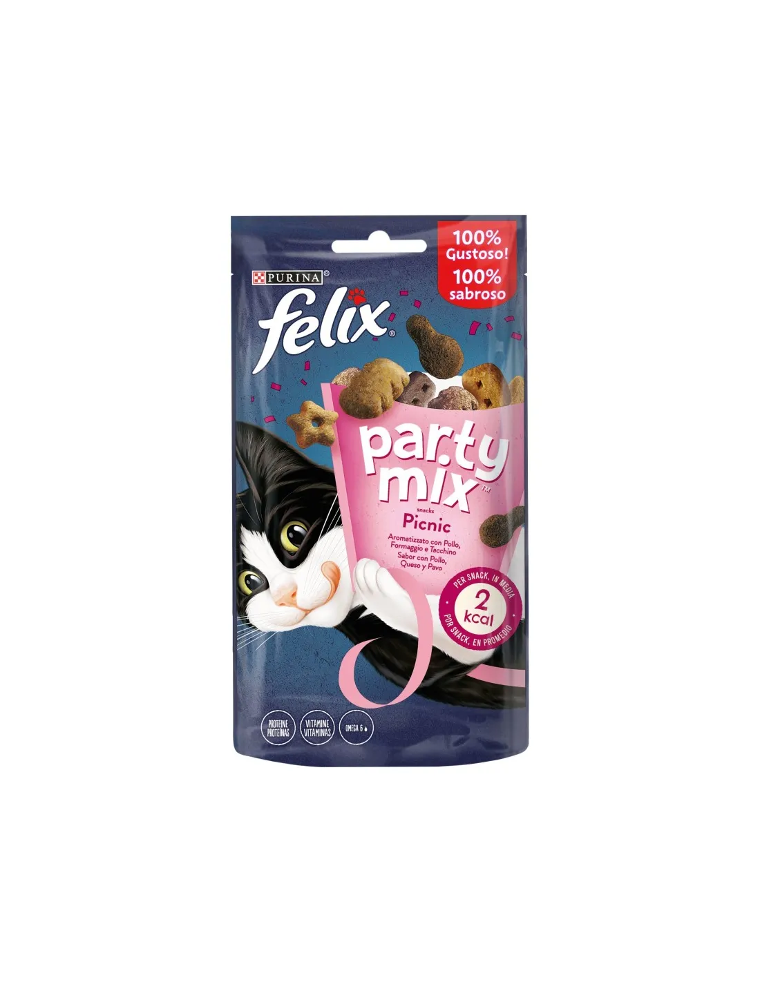 Purina Felix Party Mix Snack Cat Picnic Mix ist ein köstlicher Snack für Katzen, der die Aromen von Huhn, Käse und Truthahn kombiniert. Diese Geschmacksmischung wurde speziell entwickelt, um den anspruchsvollsten Gaumen von Katzen zu befriedigen.