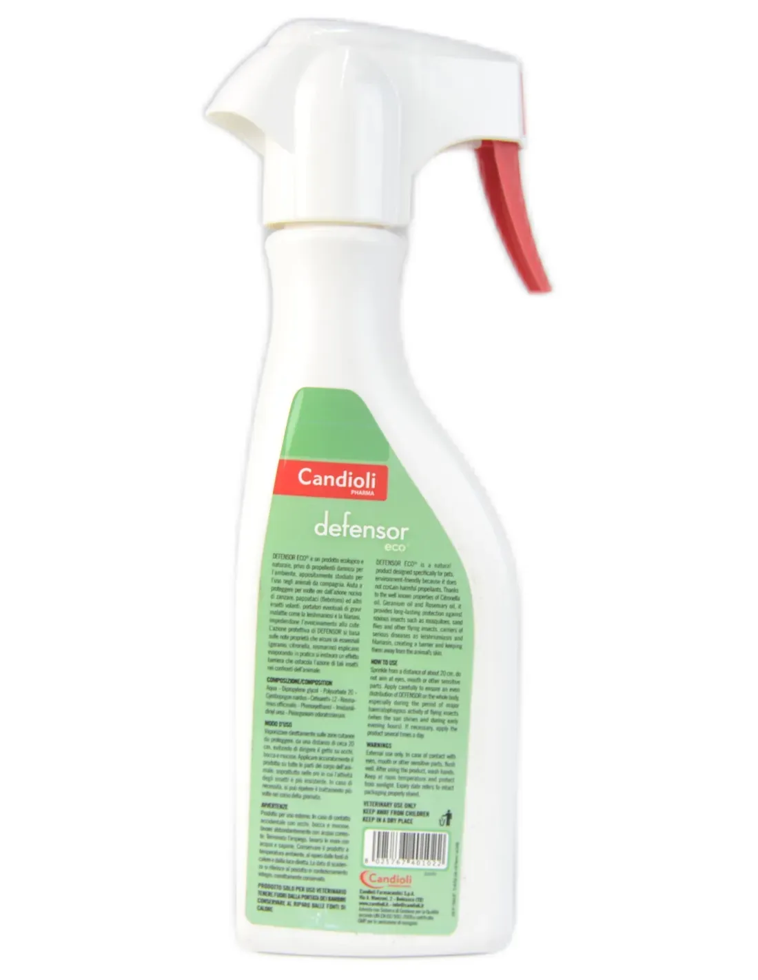 Defensor eco ist ein ökologisches und natürliches Produkt, frei von umweltschädlichen Treibmitteln, das speziell für die Anwendung bei Haustieren entwickelt wurde. Es schützt vor der schädlichen Wirkung von Mücken, Sandmücken (Sandmücken) und Fluginsekten, die Träger möglicher Krankheiten wie Leishmaniose und Filariose sind, und verhindert, dass sie in die Nähe der Haut gelangen. Die Schutzwirkung von Defensor Eco basiert auf den bekannten Eigenschaften, die einige ätherische Öle (Geranie, Zitronengras, Rosmarin) beim Verdunsten aufweisen: Es entsteht eine Barrierewirkung, die die Wirkung dieser Insekten auf das Tier behindert.
