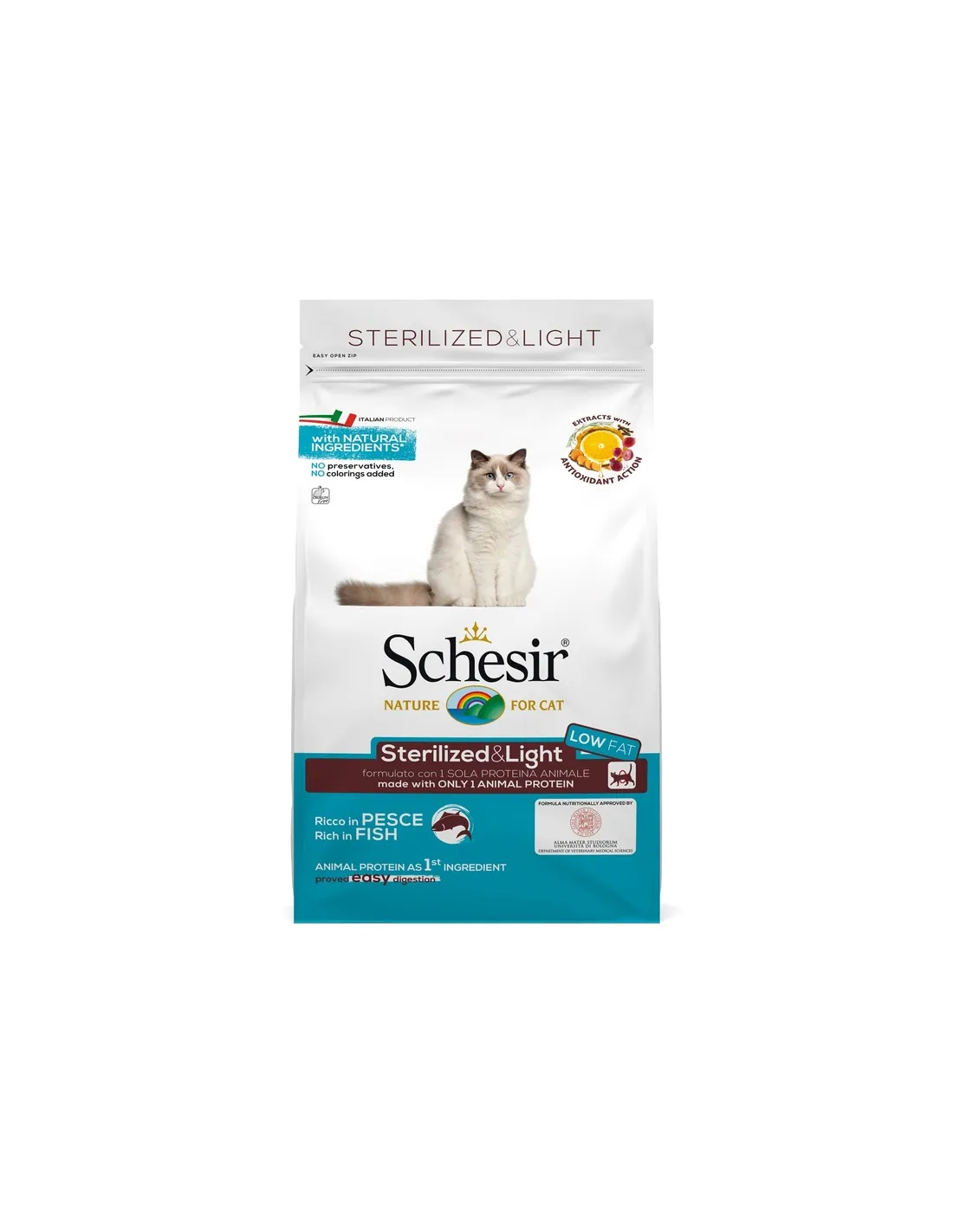 „Sterilisiert und leicht reich an Fisch 400 g“ von Schesir ist ein komplettes und ausgewogenes Trockenfutter, das speziell auf die Ernährungsbedürfnisse sterilisierter erwachsener Katzen aller Rassen zugeschnitten ist. Dieses Produkt zeichnet sich durch seine einzigartige Formel aus, die Fisch als Hauptquelle tierischer Proteine verwendet und so eine schmackhafte und leicht verdauliche Mahlzeit garantiert. Das besondere Augenmerk auf die Gesundheit der Katze spiegelt sich im geringen Fettgehalt und hohen Ballaststoffgehalt wider, die zur Erhaltung des Idealgewichts des Tieres beitragen. Darüber hinaus ist es aufgrund des Verzichts auf zugesetzte Farb- und Konservierungsstoffe eine sichere und gesunde Option für Ihre Katze. Die Anwesenheit von Bierhefe und Biotin trägt dazu bei, das Fell glänzend und die Haut gesund zu halten, während eine spezielle Mischung aus aromatischen Pflanzenextrakten eine synergistische antioxidative Wirkung bietet. Die Formel von „Sterilisiert und leicht, reich an Fisch 400 g“ wurde sorgfältig ausbalanciert, um alle täglichen Bedürfnisse erwachsener Katzen zu erfüllen und eine vollständige Ernährung zu gewährleisten, die das Wohlergehen der Tiere im Einklang mit Schesirs tierversuchsfreier Philosophie gewährleistet.