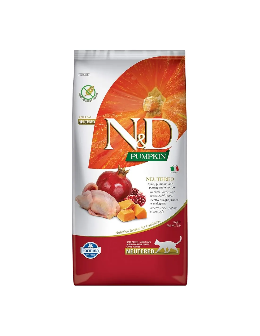 Farmina n&d Pumpkin Cat kastrierte Wachtelkürbis und Granatapfel 5 kg ist ein Alleinfuttermittel für sterilisierte ausgewachsene Katzen.