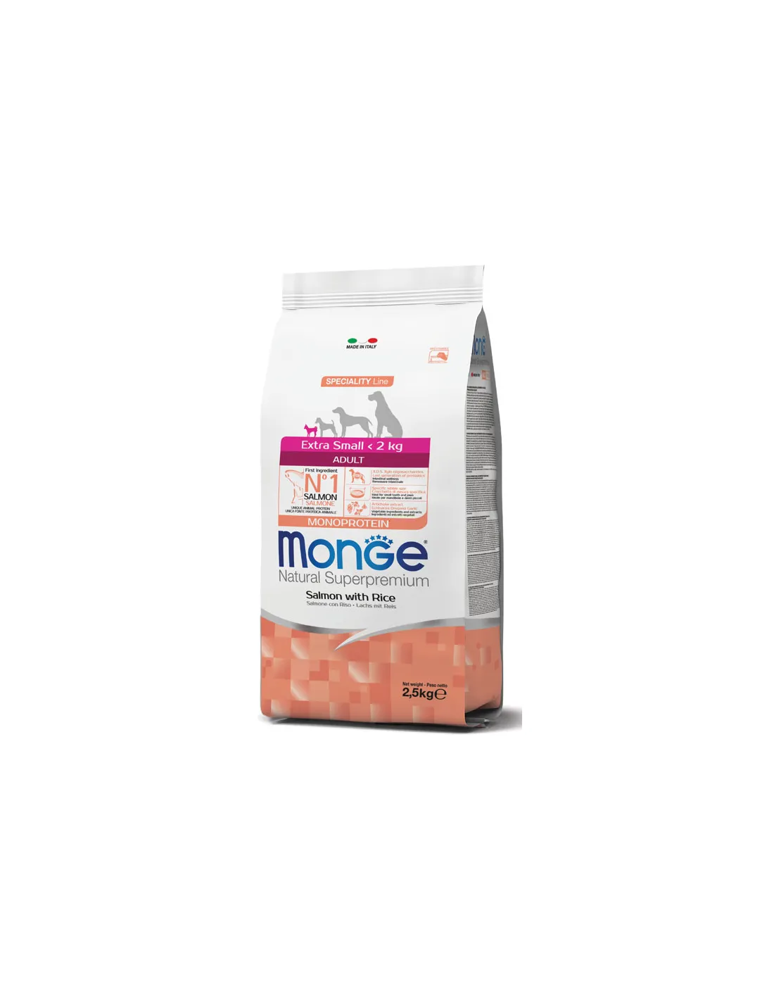 It is a complete food for extra small breed adult dogs. Specifically developed with your dog's well-being in mind, thanks to the presence of quality nutrients resulting from Made in Italy research. Product formulated with a single animal protein source*, salmon is the first ingredient, and with the inclusion of fresh fish for optimal digestibility and palatability. The recipe is enriched with latest generation prebiotics xylo-oligosaccharides (xos) to support intestinal well-being. The formulation contains ingredients and plant extracts, such as echinacea root, oregano, garlic and artichoke extract and an optimal omega-6/omega-3 ratio to maintain the shine of the fur thanks to the presence of salmon oil. The kibble size was developed for small teeth and jaws. *May contain traces of other protein sources