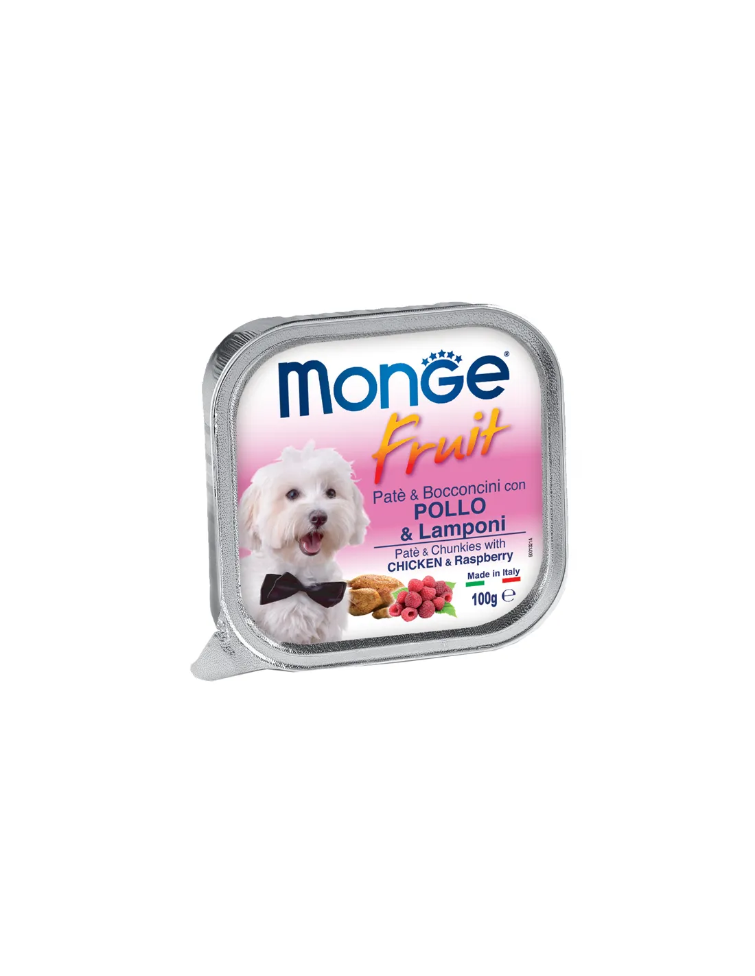 Monge Fruit Paté and Bites with Chicken and Raspberries is a complete and digestible food for adult dogs, formulated to offer daily nutritional support. This pâté is enriched with fresh chicken nuggets and raspberries, providing a natural source of vitamins and minerals essential for the health of your four-legged friend. Ideal for small dogs, it can also be used as a treat for larger dogs. Produced in Italy, Monge Fruit is committed to not testing on animals and to guaranteeing a diet free of artificial colors and preservatives. The 100 g package is practical and ideal for maintaining the freshness of the product.