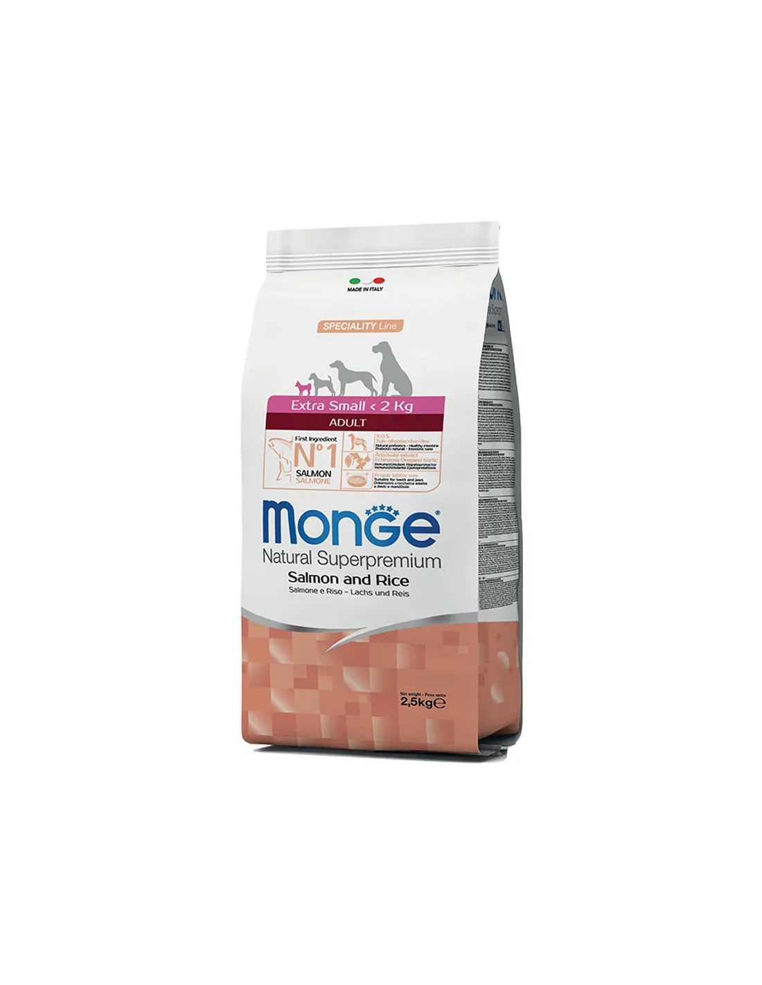 Monge Dog Natural Extra Small Adult Salmon and Rice is indicated for the daily diet of small adult dogs. This product helps maintain ideal weight, supports healthy digestion and promotes optimal physical condition.