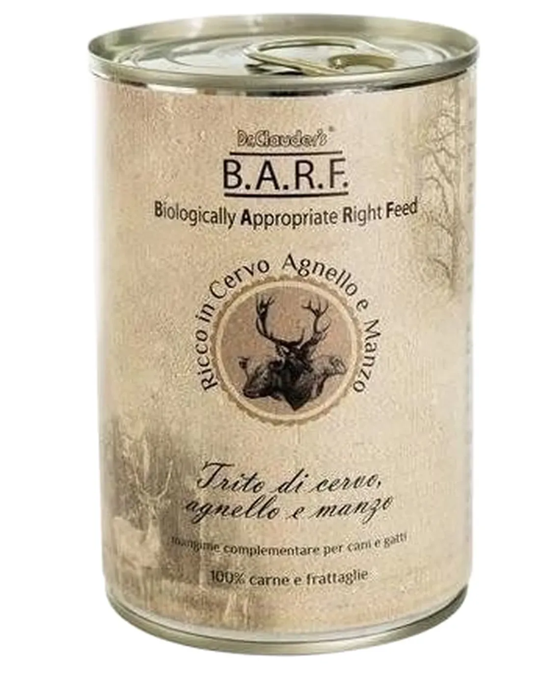 Animal by-products: deer (heart, meat) (33%), lamb (heart, meat, liver, lung and tripe) (33%), beef (heart, meat, liver, lung and tripe) (34%).