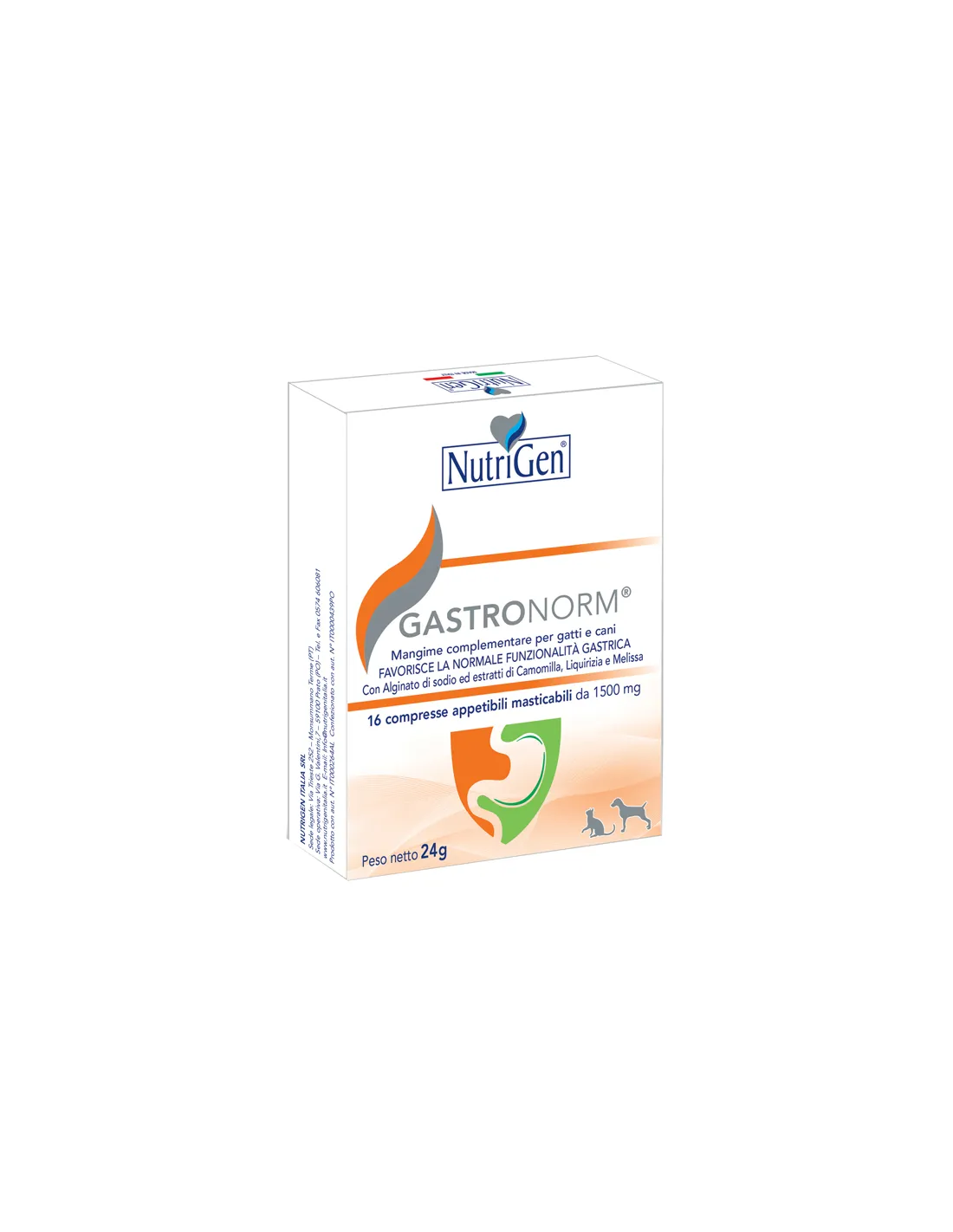 Nutrigen Gastronorm is a complementary food for dogs and cats, available in packs of 16 tablets of 1500 mg. This product is formulated with sodium alginate and Chamomile, Licorice and Melissa extracts to promote the normal function of the upper gastrointestinal tract. The tablets are palatable and chewable, making administration to your pet easy.