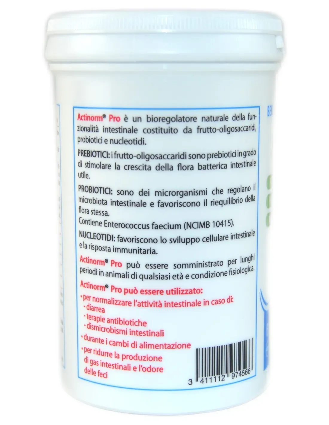 Fos (fructo-oligosaccharides) are prebiotics that offer an optimal substrate for the growth of useful microorganisms (bifidobacteria, lactobacilli and bacteroids), Enterococcus faecium strain ncimb 10415 is a probiotic that restores the correct intestinal microflora and the nucleotides promote intestinal cellular development and the immune response.