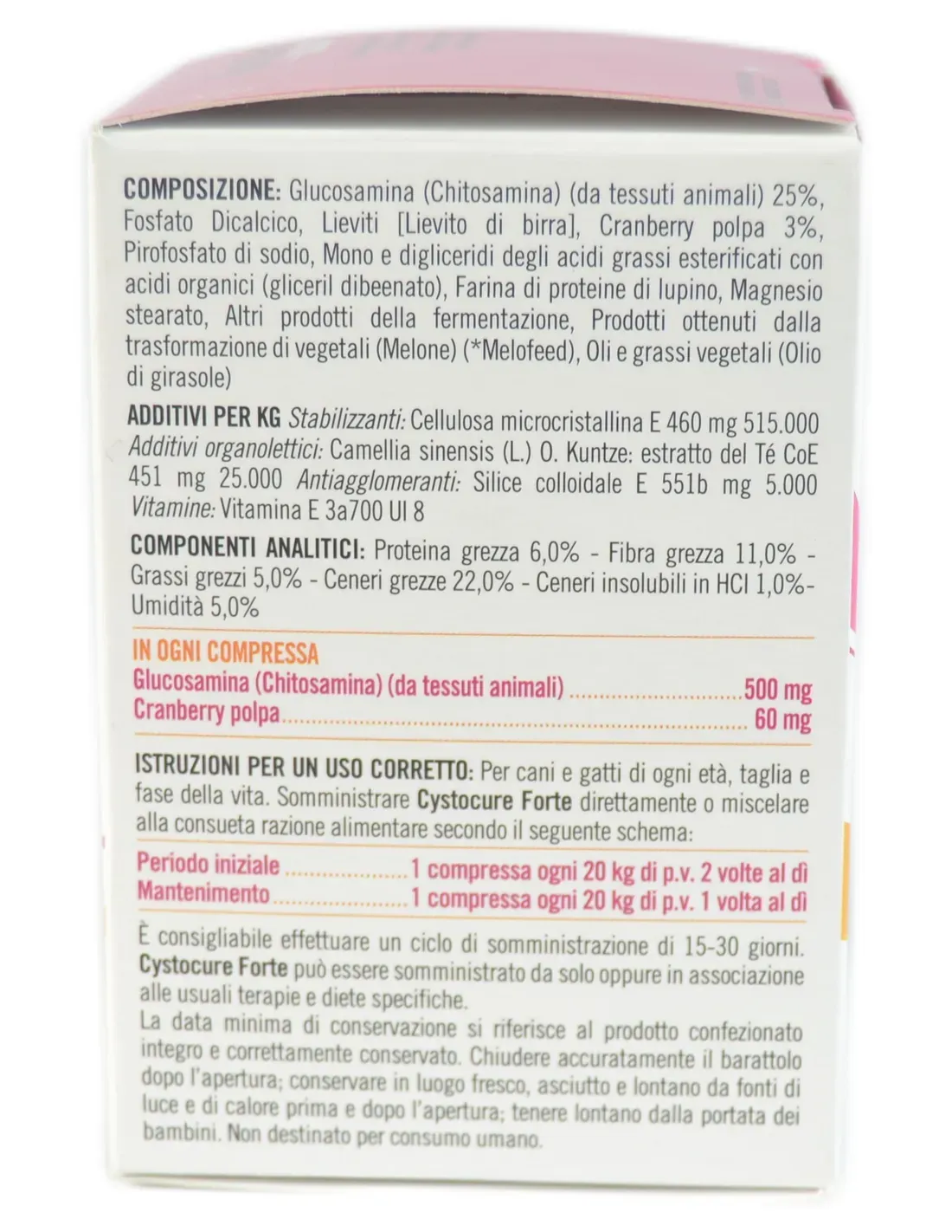 CystoCure Forte is indicated as a complementary remedy in urinary tract infections (UTI), both during the acute phases in association with specific therapies indicated by the treating veterinarian, and in recurrent or relapsing forms, alone or in association with specific diets recommended by the veterinarian.