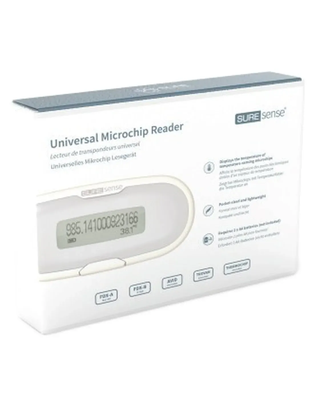 The Sure Sense Microchip Reader is a portable device designed for quickly and reliably reading microchips implanted in pets. This tool is essential for veterinarians, animal shelters, breeders and pet care operators, offering an effective solution for identifying and tracking animals via RFID technology.