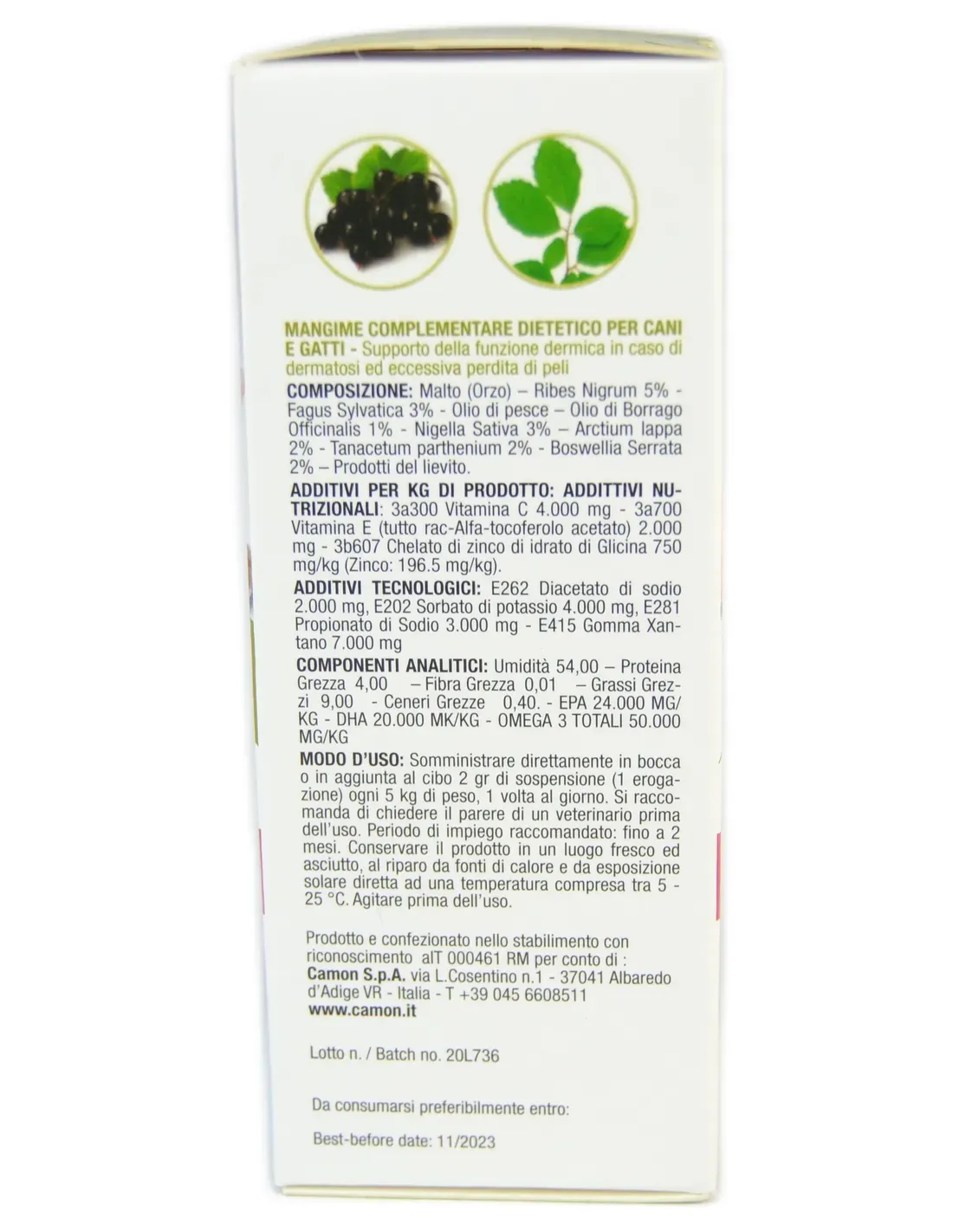 Complementary dietary feed for dogs and cats. Support of the dermal function in case of dermatosis and excessive hair loss.