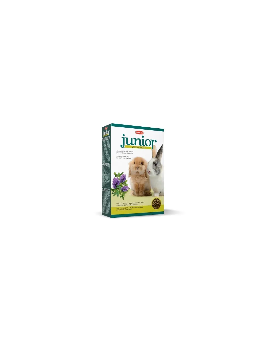 "Padovan Junior Coniglietti" is a complete food in pellet form, specifically formulated for baby dwarf rabbits. This food is ideal for supporting the healthy and balanced growth of dwarf rabbits during the first months of life. The 850 gram package offers an adequate amount to manage your small animal's daily nutrition. The product is enriched with essential vitamins and minerals that contribute to the correct physical development of the baby dwarf rabbit.