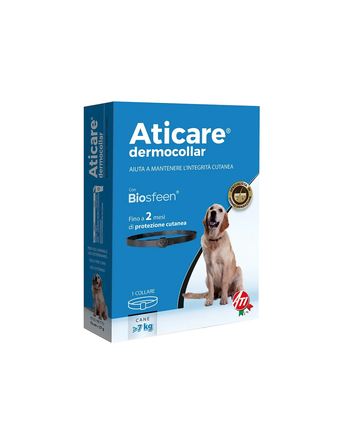 Do not use the Aticare Dermocollar collar on puppies under 7 weeks of age or on dogs weighing less than 7 kg. It is contraindicated in subjects with known hypersensitivity to the active ingredients or to any of the excipients of the product. In the event of the presence of extensive skin lesions on the neck or in areas of contact with the collar, it is advisable to postpone its application until the skin has completely healed. Use is not recommended in dogs with acute untreated dermatological pathologies and in subjects with a history of serious allergic reactions to pesticide products. Always consult your veterinarian before application if your dog has particular health conditions. Avoid concomitant use with other products containing similar compounds to prevent adverse reactions due to overdose.