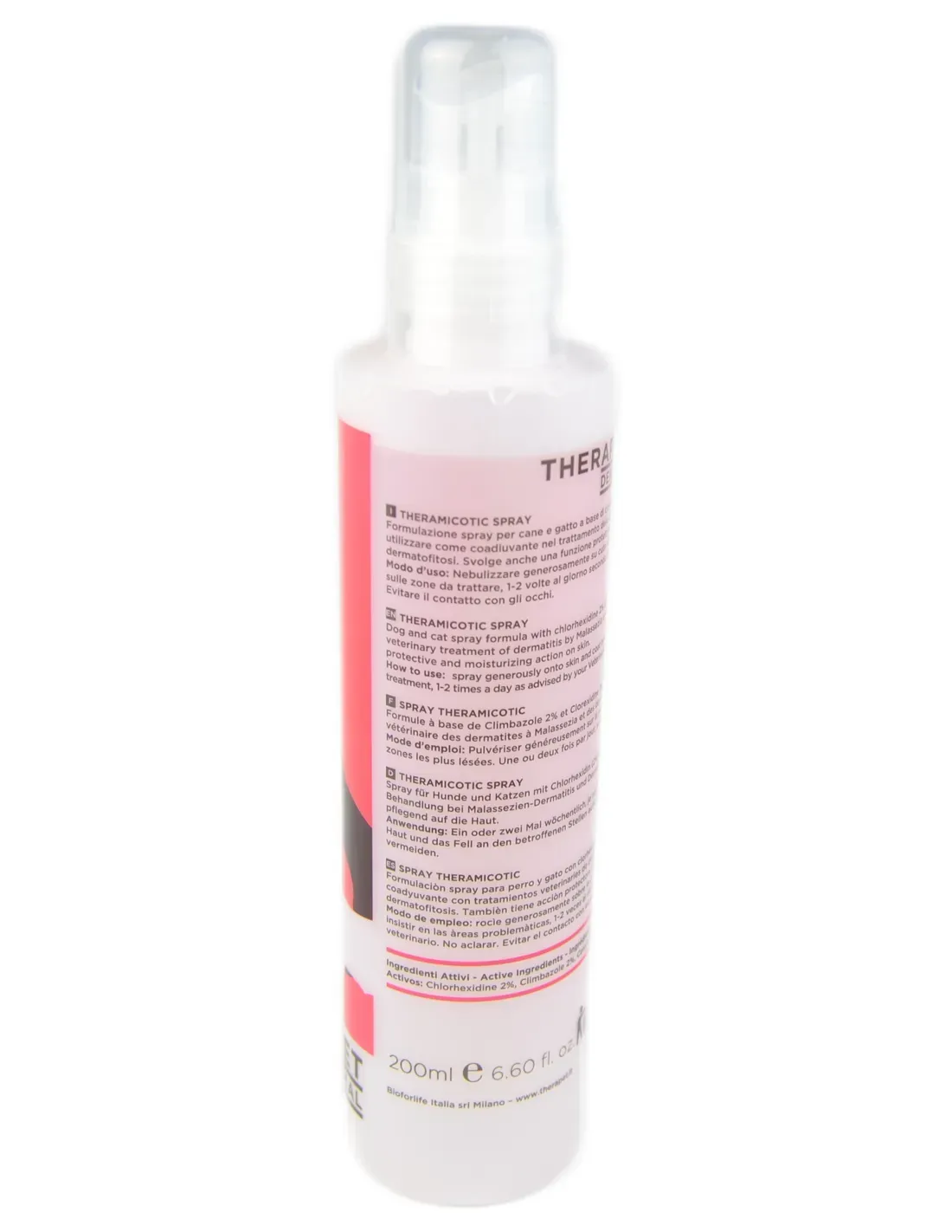 tèramicotic spray adjuvant in the treatment of malassezia dermatitis and dermatophytosis. The chlorhexidine-climbazole 2% association makes teramicotic spray an effective product in the management of dermatitis in which a bacterial and yeast infection is simultaneously present. The dual antifungal action of chlorhexidine and climbazole allows the use of tetramicotic spray also in the topical treatment of localized and generalized dermatophytosis, as an adjunct to systemic antifungal therapy.