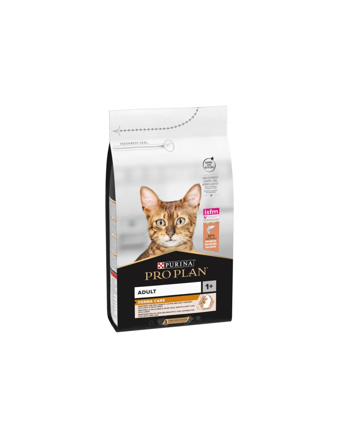 PURINA PRO PLAN ELEGANT ADULT CAT 1+ SALMON 1.5 KG is a complete and balanced food specifically formulated for adult long-haired cats. This product is ideal for keeping skin healthy and fur shiny and silky. Thanks to its exclusive OPTIderma formula, enriched with essential nutrients, it helps nourish the skin and reduce the formation of hair balls. The presence of high fiber content increases intestinal motility, facilitating the natural elimination of ingested hair and helping to control the formation of balls of hair. Furthermore, the high protein content supports skin health and limits excessive shedding.