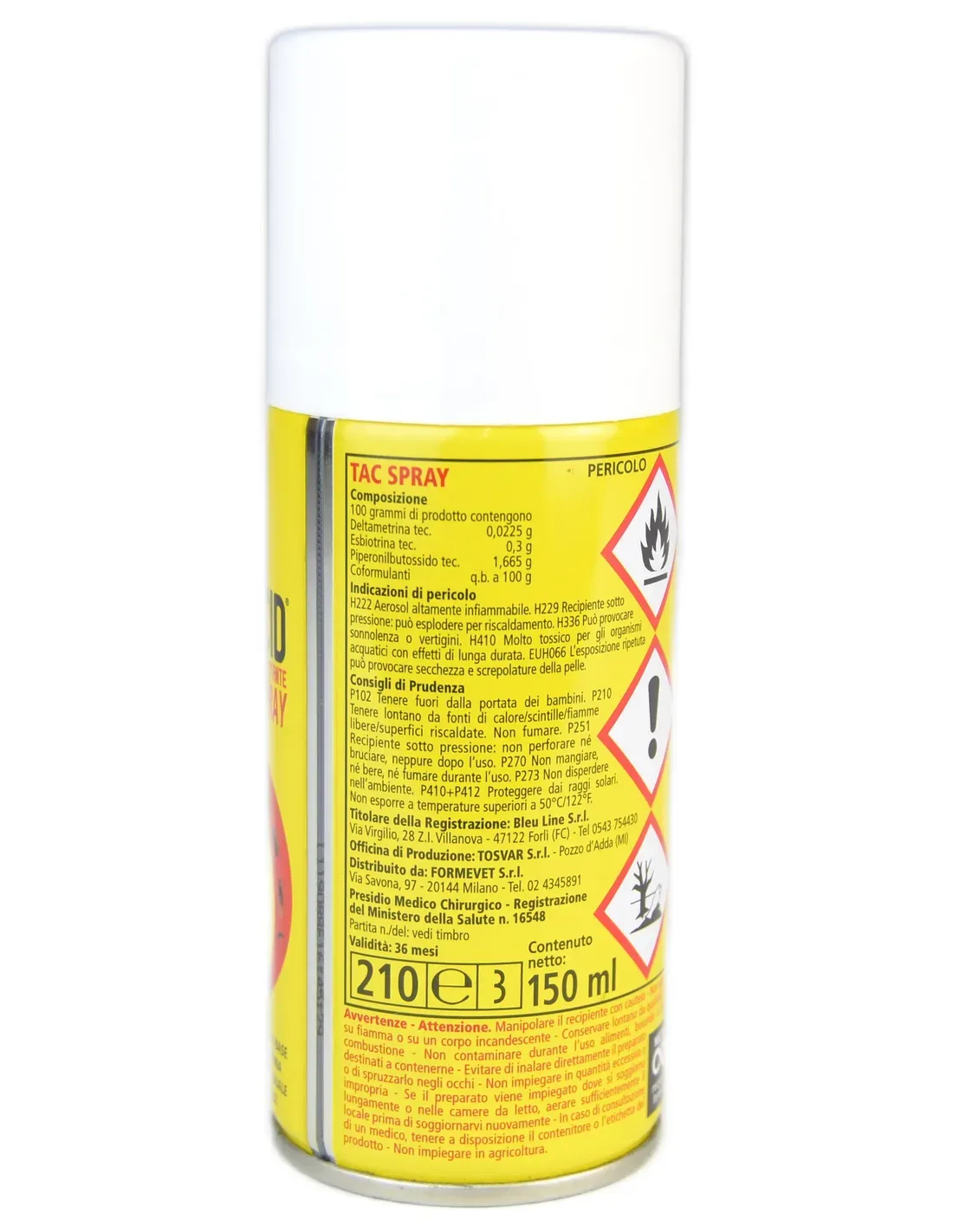Tac spray is a ready-to-use insecticide based on synthetic, synergized pyrethroids with a rapid and persistent killing action. It is very useful for fighting both mosquitoes (culex pipiens, anopheles spp.), tiger mosquito (aedes albopictus), flies (musca domestica) and other flying insects, as well as crawling insects such as cockroaches, ants, silverfish, weevils, tribbles and other harmful or annoying arthropods such as spiders and bed bugs. It is therefore useful for use in domestic environments where maximum safety for people and pets is guaranteed. Tac spray can be effectively used in: warehouses, food warehouses, industrial environments in general, homes, cellars, schools, kindergartens, gyms, changing rooms, barracks, cinemas, theatres, waiting rooms at stations and airports, means of transport, tourist villages, campsites, canteens, hotels, restaurants, hospitals, nursing homes, rest homes and in all those environments where disinfestation is necessary.
