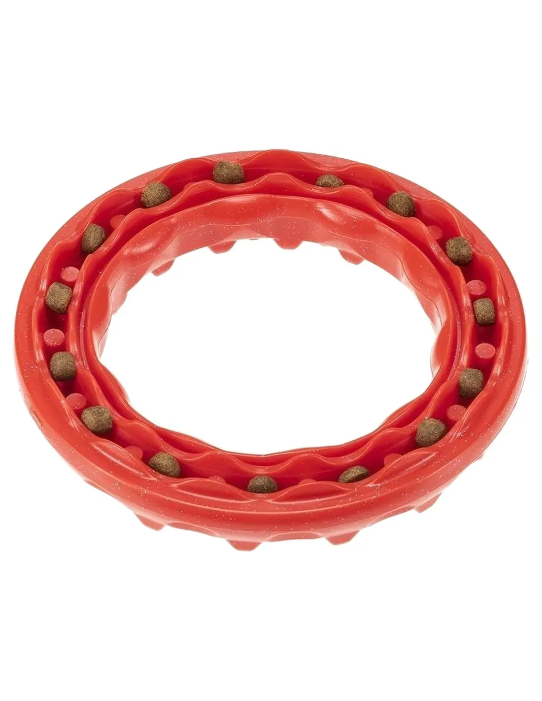 The Ferplast Smile large red ring dental toy is made of resistant thermoplastic rubber, designed to help clean the dog's teeth during play. The ring shape stimulates chewing and helps remove plaque and tartar.