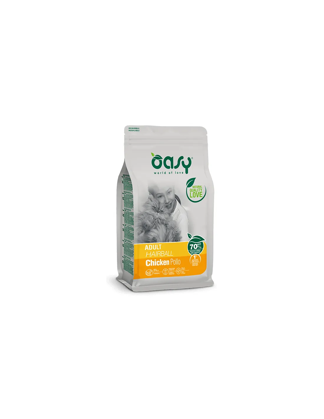Oasy Hairball Adult is formulated without artificial colors or flavourings, to offer the most natural nutrition possible. It is important to follow the food transition instructions to avoid digestive disorders during the change of diet.