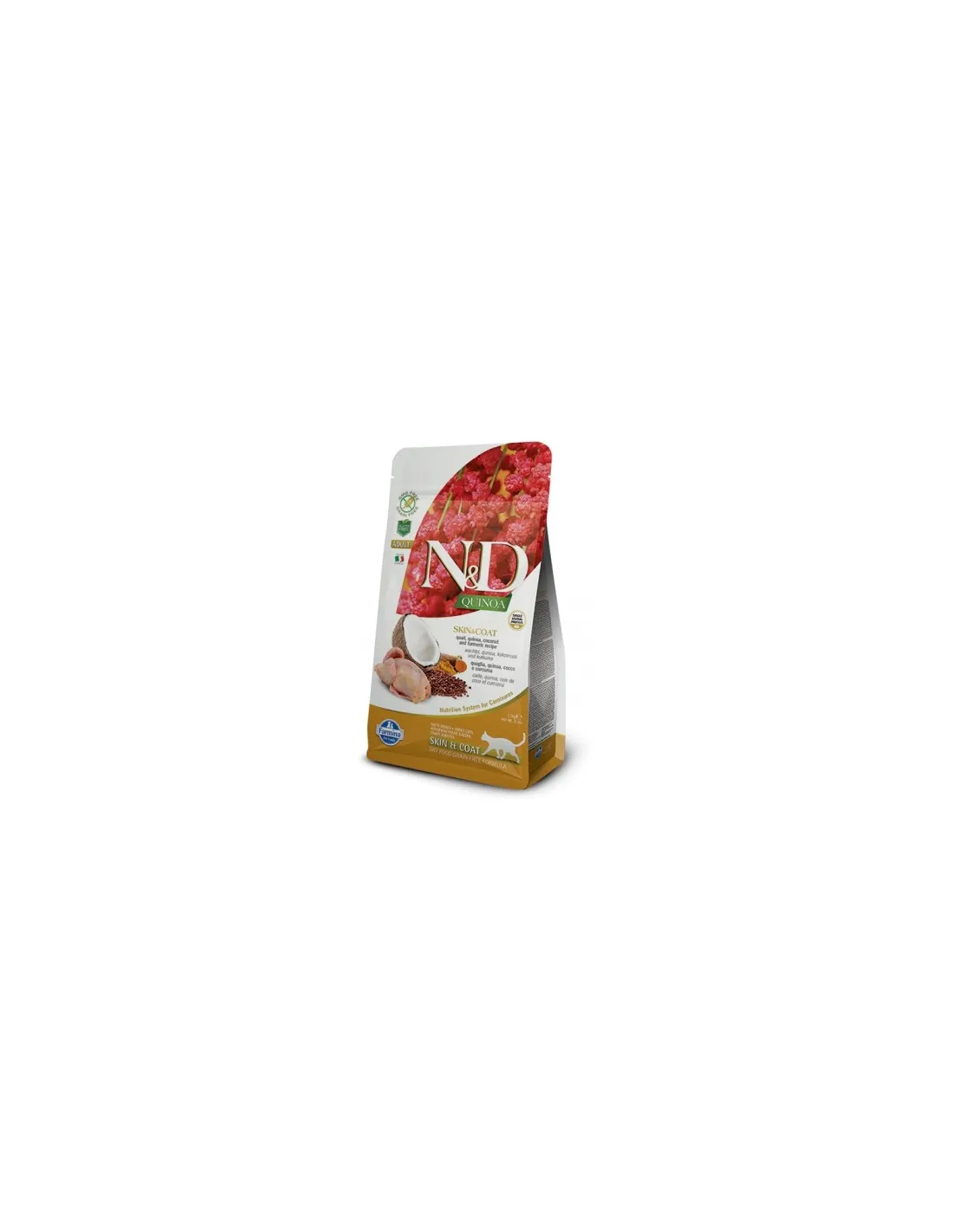 Farmina n&d quinoa cat skin&coat quail 300 gr is a complete food for adult cats based on quail, quinoa, coconut and turmeric. A special formula for food intolerances, useful for restoring and maintaining the skin and the well-being of the hair.