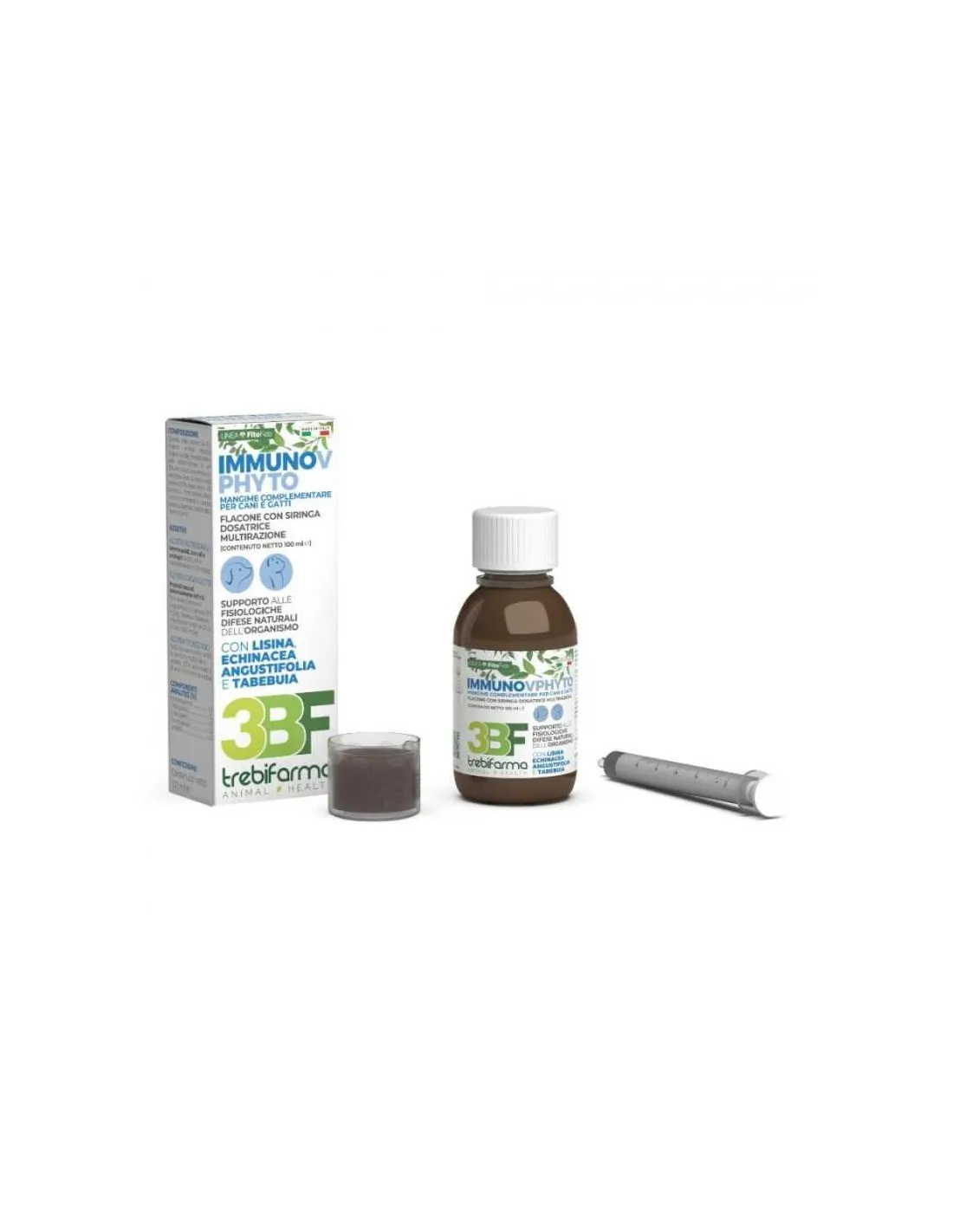 Trebifarma Immunov Phyto 100 ml is a complementary feed designed to support the body's natural immune defenses. This product provides Lysine, Tabebuia and Echinacea angustifolia extract, all known for their beneficial properties for the immune system.