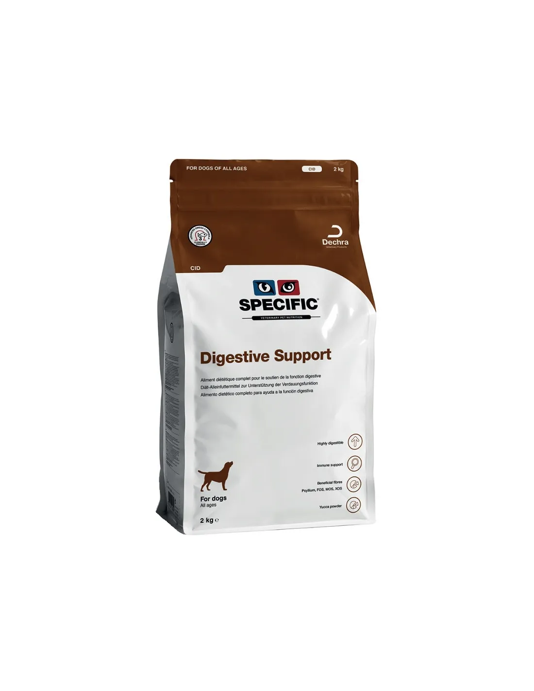 Specific CID Digestive Support (2 kg) is a dietetic food formulated for small and medium-sized dogs suffering from gastrointestinal disorders such as enteropathies, malabsorption and pancreatic insufficiency. Its highly digestible composition reduces the gastric load and supports the stability of the intestinal mucosa, making it also ideal for post-gastroenteritis recovery or during pharmacological therapies. The 2 kg format allows for practical management of a controlled diet.