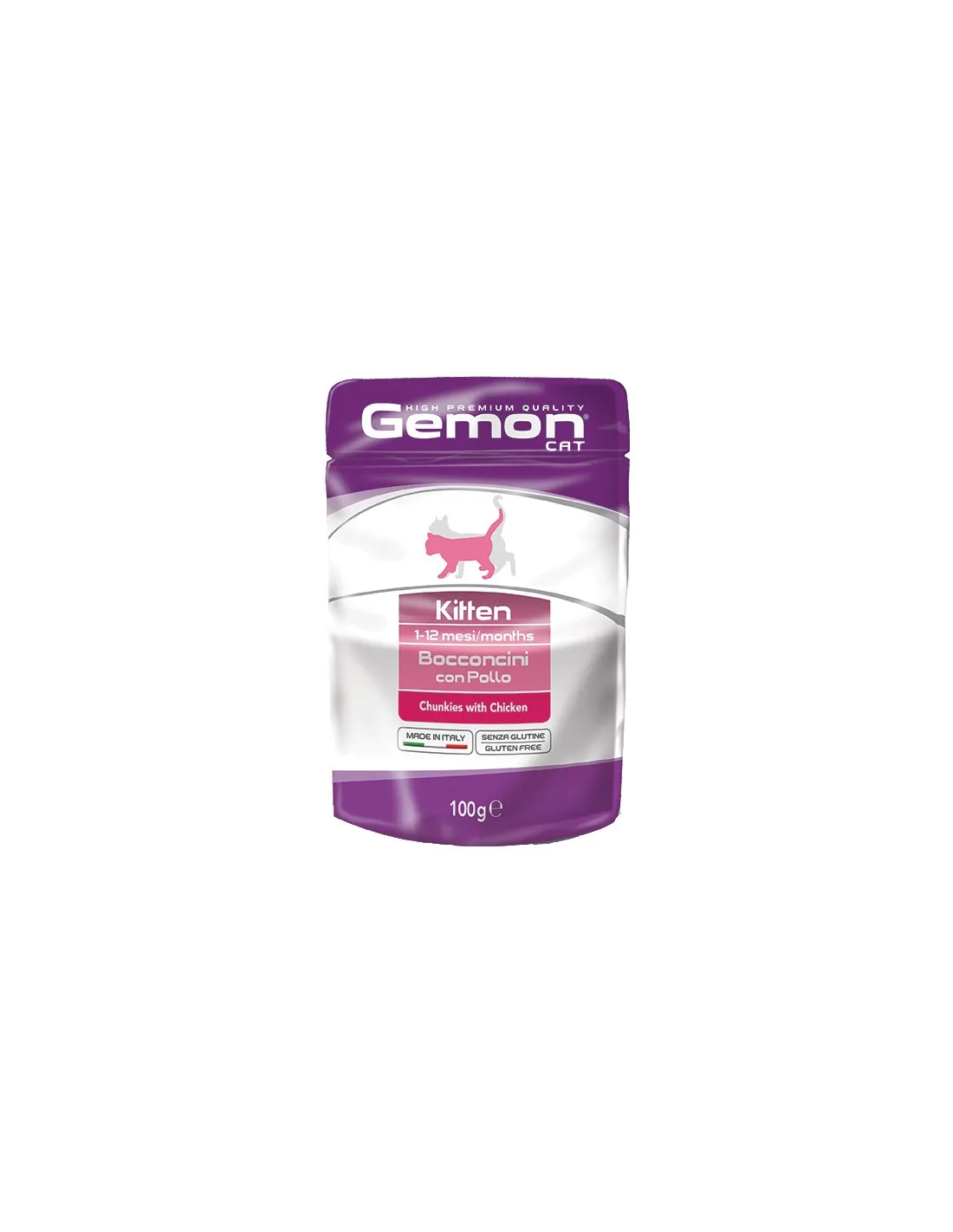 Gemon Bocconcini Con Pollo is a wet food for kitten cats, sold in a practical 100g bag. It is a complete food, formulated to provide all the nutrients necessary for the daily vitality of kittens. The product is composed of 45% meat and derivatives (of which chicken min. 20%), mineral substances, fish and fish by-products (source of chondroitin), molluscs and crustaceans (source of glucosamine).