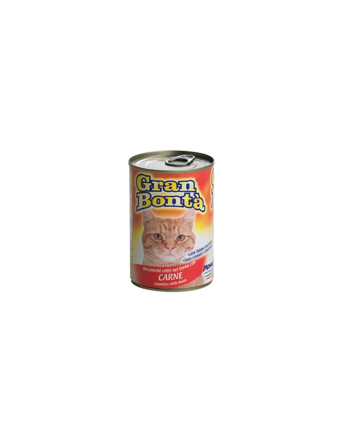 Gran Bontà All Breeds Adult Chunks with Meat is a complete food for adult dogs of all sizes. This product is formulated with easily digestible ingredients such as meat, which provides essential proteins and minerals to support your dog's daily vitality. The food is balanced with vitamins A-D3-E to meet the nutritional needs of your pet. Contains no added artificial colors and preservatives. It is produced in Italy and has not been tested on animals. The package is available in two sizes: 400 g and 1230 g.