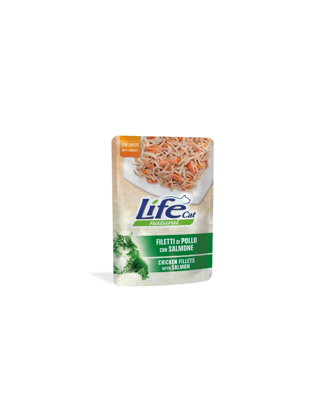 LifeCat Natural offers a range of 70g sachets that contain complete and balanced meals for adult cats. Each sachet is a rich source of protein thanks to the high content of chicken and salmon fillets, enriched with carrots and rice for a balanced intake of fiber and carbohydrates.