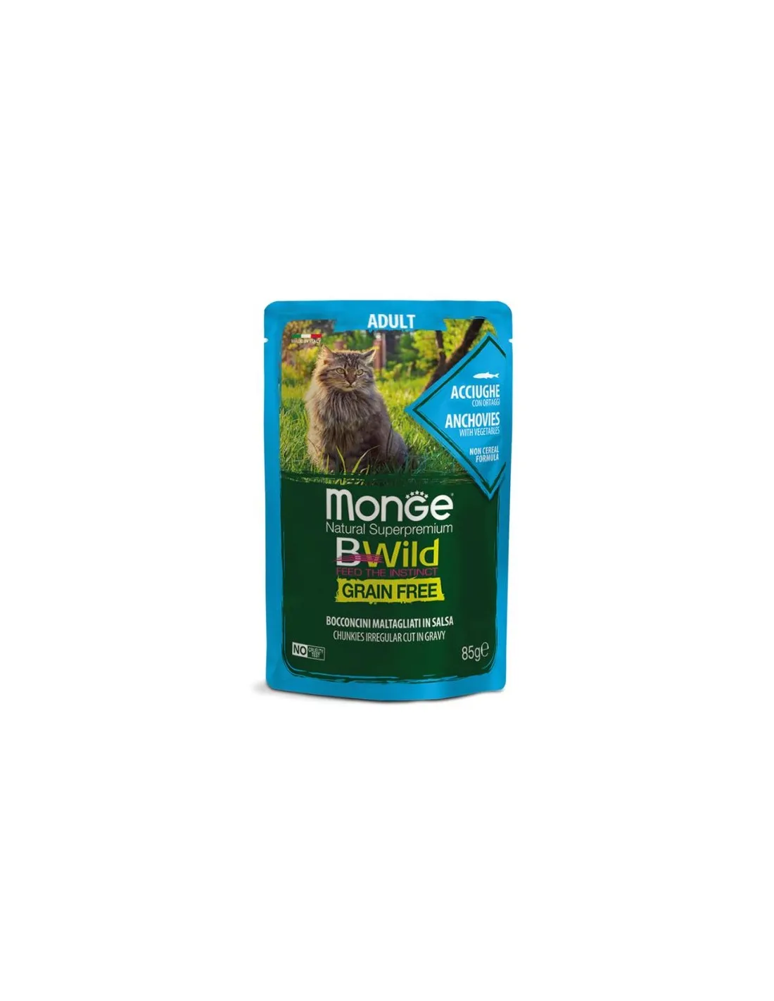 Monge Bwild Grain Free Adult Anchovies and Vegetables is a complete food for adult cats, formulated to meet the specific nutritional needs of felines. This product is grain-free and enriched with anchovies and fresh vegetables, guaranteeing a tasty and nutritious meal. Packaged in practical 85 gram bags, it is ideal for keeping food fresh and tasty.