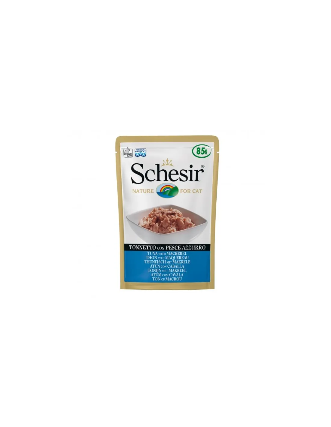 Agras Schesir cat Tuna with Blue Fish 85 g in bag is a complementary wet food for adult cats that combines the delicious taste of tuna with blue fish, known for its high omega 3 content. This product is ideal for cats who love the flavors of the sea and prefer a more compact consistency in their bowl. The gelatin preparation helps maintain moisture and enhance the natural flavor of the fish.
