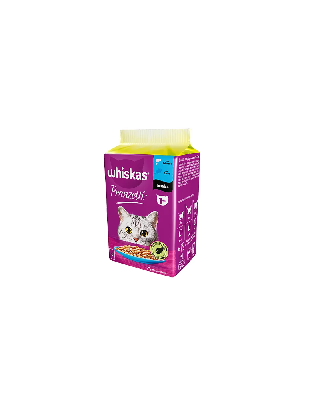 Whiskas Pranzetti is a complete food for adult cats that combines delicious pieces of salmon and tuna in a rich sauce. Each pack contains 6 sachets of 50 grams each, ideal for keeping the meal always fresh and appetizing.