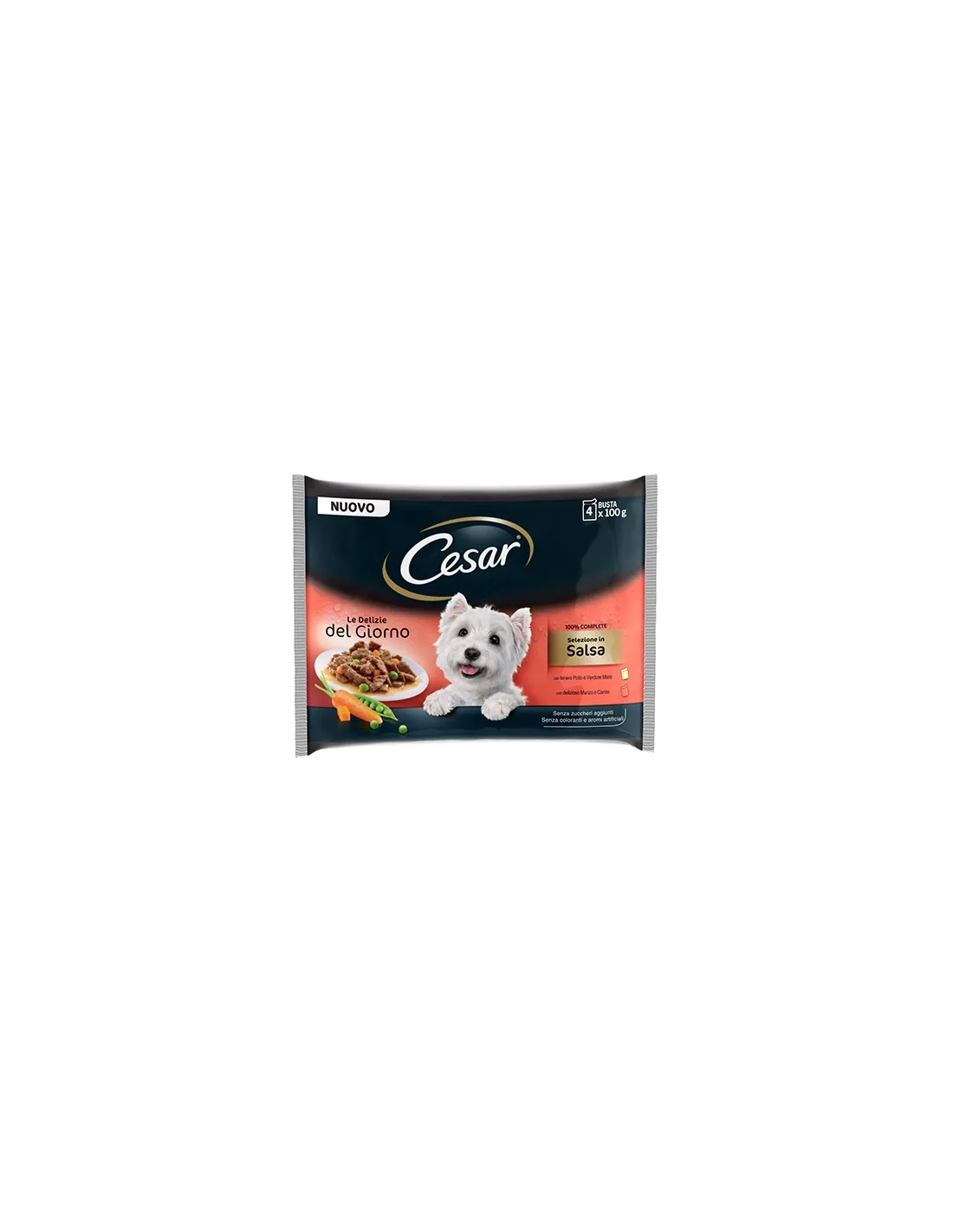The product "Cesar Dog Chicken and Vegetables and Beef and Carrots 4x100 gr" is suitable for dogs of all breeds and sizes. A mix of wet and dry CESAR® complete food is recommended for a tasty experience. This product provides a complete and balanced diet for your dog, rich in proteins, essential vitamins and minerals.