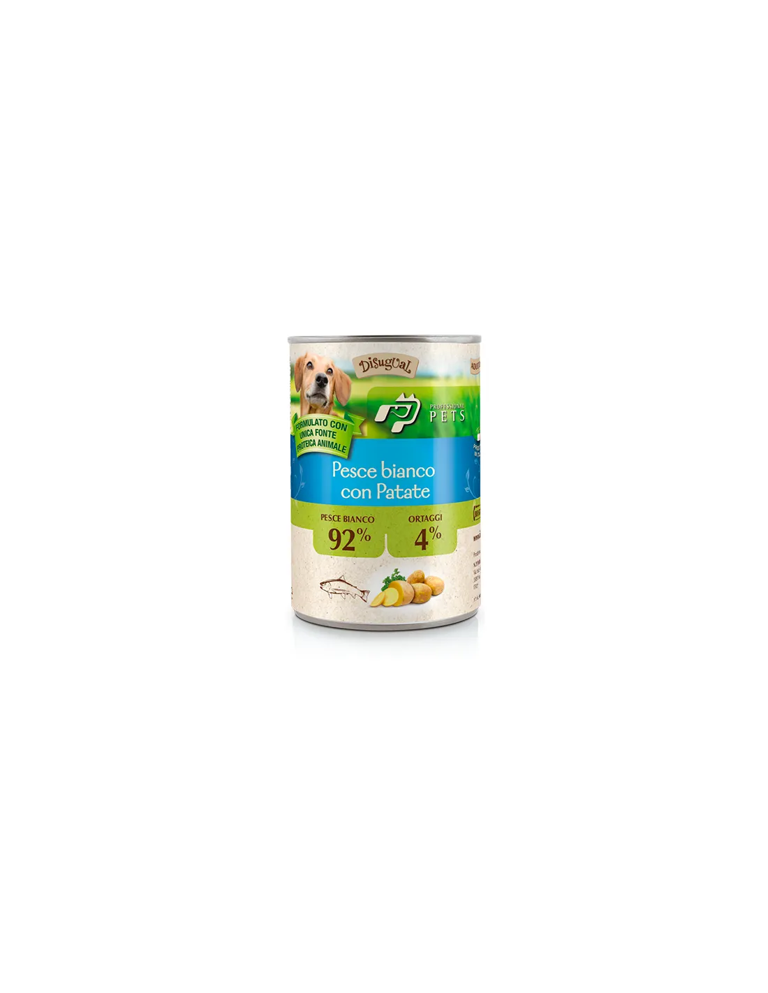 "Professional pets white fish potatoes" is a complete wet food for adult dogs, formulated with a single animal protein source and enriched with vegetables. It does not contain artificial preservatives, colors or flavourings. Each can contains 92% fish and 4% vegetables, the remaining 4% is made up of vegetable jellies, vitamins and mineral salts to make it a truly complete meal. It is a made in Italy product prepared only with selected raw materials. The composition includes fish and fish by-products (white fish 92%), vegetables (potatoes 4%), mineral substances, sugars. It is gluten free and grain free.