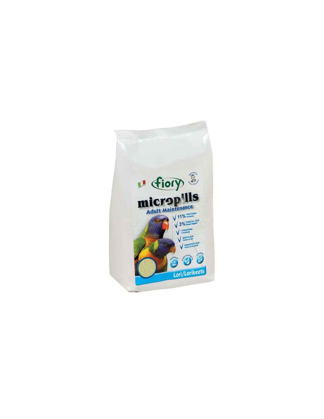The FIORY MAINTENANCE LORI ADULT GR 800 feed is composed of a variety of seeds and granules that provide complete and balanced nutrition. Main ingredients include: striped sunflower seeds, straw millet, safflower, white millet, canary seed, red millet, corn, wheat and hulled oats. These are supplemented by granules that contain bakery products, by-products of vegetable origin, 10% honey, mineral substances, oils and fats, fruit flavouring, and are colored and preserved with CE additives. The yeasts present in the granules support the digestion and absorption of nutrients.