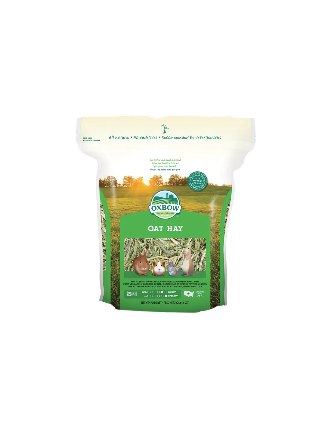 The "Oxbow Oat Hay 425 gr" is a high quality feed for rodents and rabbits, hand selected to guarantee the best nutrition. This oat hay is harvested at an early stage of maturation, before the oats develop seed, to preserve the fiber-rich husks and stimulate the animals' appetite.