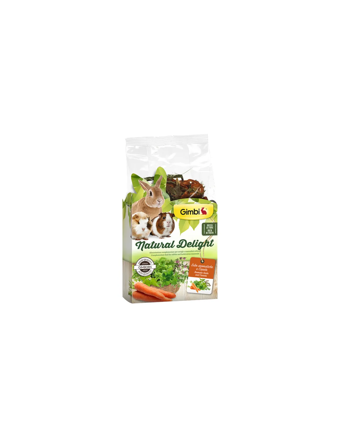 GIMBI Natural Delight Aromatic Herbs and Carrots is a mixture of aromatic herbs and dried carrots, ideal as a food supplement for rodents. This product offers a high percentage of crude fibre, essential for the diet of rodents, and provitamin A, thanks to the presence of carrots.