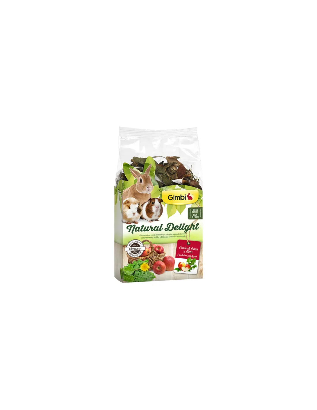 GIMBI Natural Delight Dandelion and Apple is a complementary feed specifically formulated for rodents and dwarf rabbits. This product combines dandelion and apples in a blend rich in raw fiber, essential for the digestive health of animals. The apple chips add a touch of sweetness, making the food irresistible for small animals.