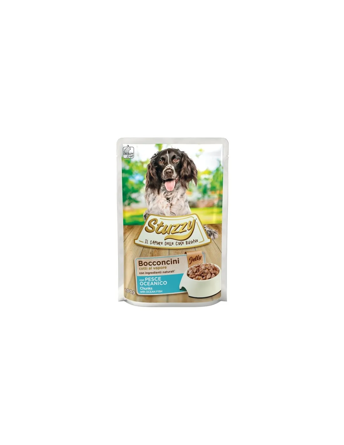 The treats with ocean fish in jelly for dogs - STUZZY are prepared with natural ingredients and steam cooked to preserve their nutritional properties. The detailed composition includes meat and derivatives, fish and fish by-products (4% hake), by-products of vegetable origin (0.4% inulin from chicory), and mineral substances. Additives per kg include vitamin D3, vitamin E, biotin, zinc and manganese. The analytical components show a composition of protein 7%, crude fibers 0.3%, crude fats 4%, crude ash 1.5% and moisture 82%.