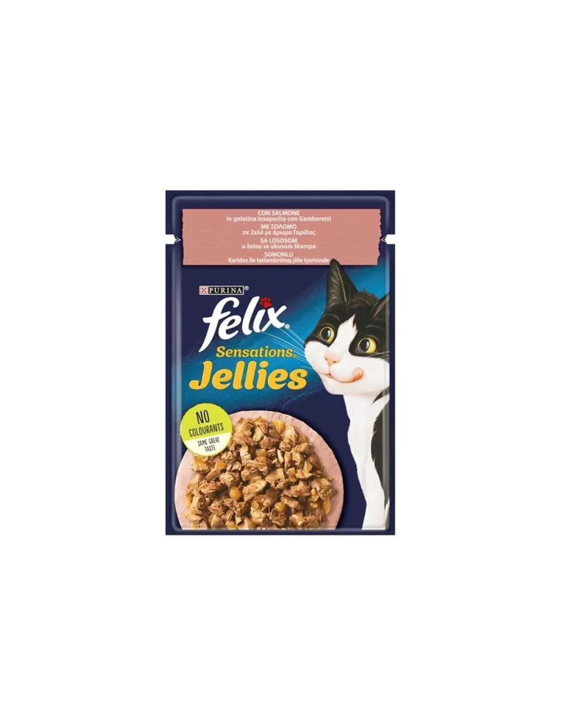 Purina Felix Sensations with jellied salmon flavored with shrimp is a unique culinary experience for your cat. This wet food is made up of tender pieces of salmon, wrapped in a delicious jelly enriched with the flavor of shrimp, which stimulates the appetite and satisfies even the most demanding palates. Each 100g sachet is a perfect portion that guarantees freshness and taste at every meal, making your cat's eating experience not only nutritious but also incredibly pleasant.