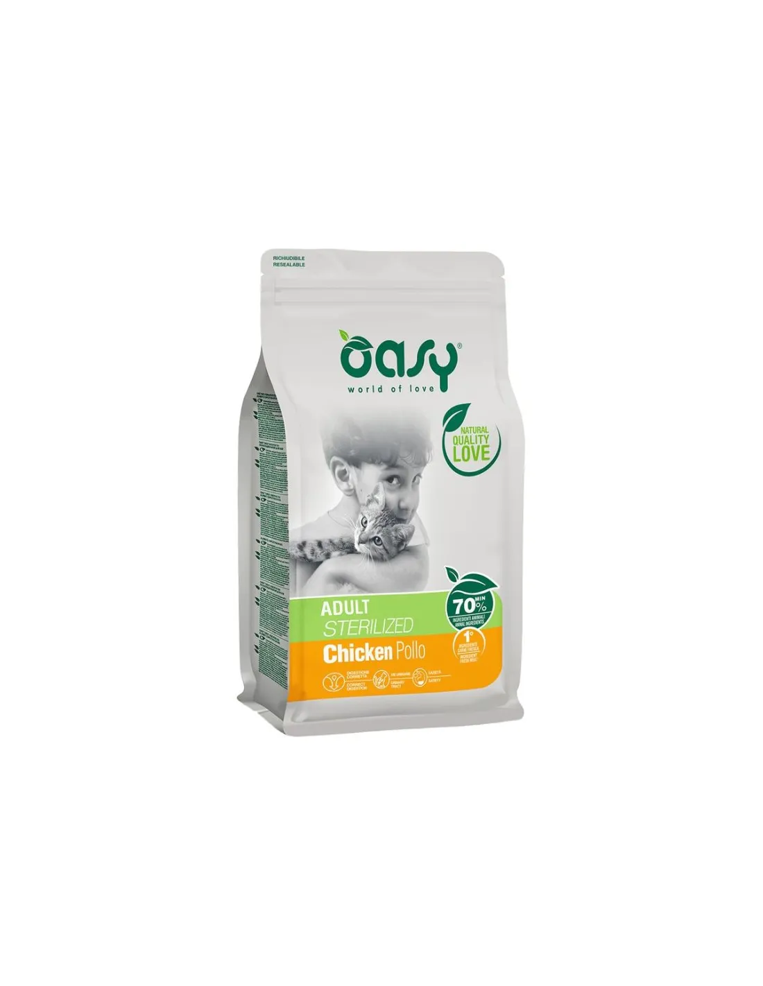 Oasy Dry Cat - Adult Chicken is suitable for adult cats that need a complete, balanced and highly digestible diet. This food is ideal for maintaining optimal health conditions, promoting the maintenance of a healthy weight thanks to a balanced energy intake. With a specific focus on digestion and nutrient absorption, the product helps preserve intestinal flora and improve gastrointestinal health.