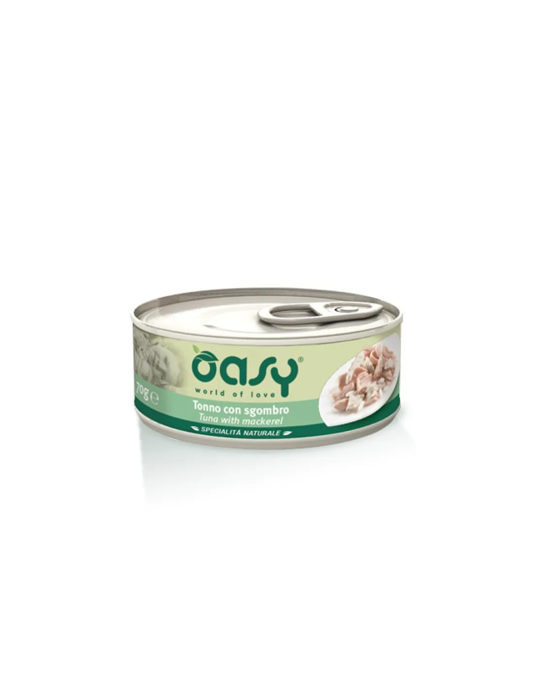 Oasy Wet Cat Natural Tuna with Mackerel is a complete food for adult cats that offers a combination of high quality ingredients. This 70 gram can has been specially formulated to meet the nutritional needs of adult cats, providing them with a tasty and nutritious meal. The presence of tuna and mackerel guarantees a high intake of proteins of animal origin, essential for maintaining muscle mass and supporting the cat's vital functions.