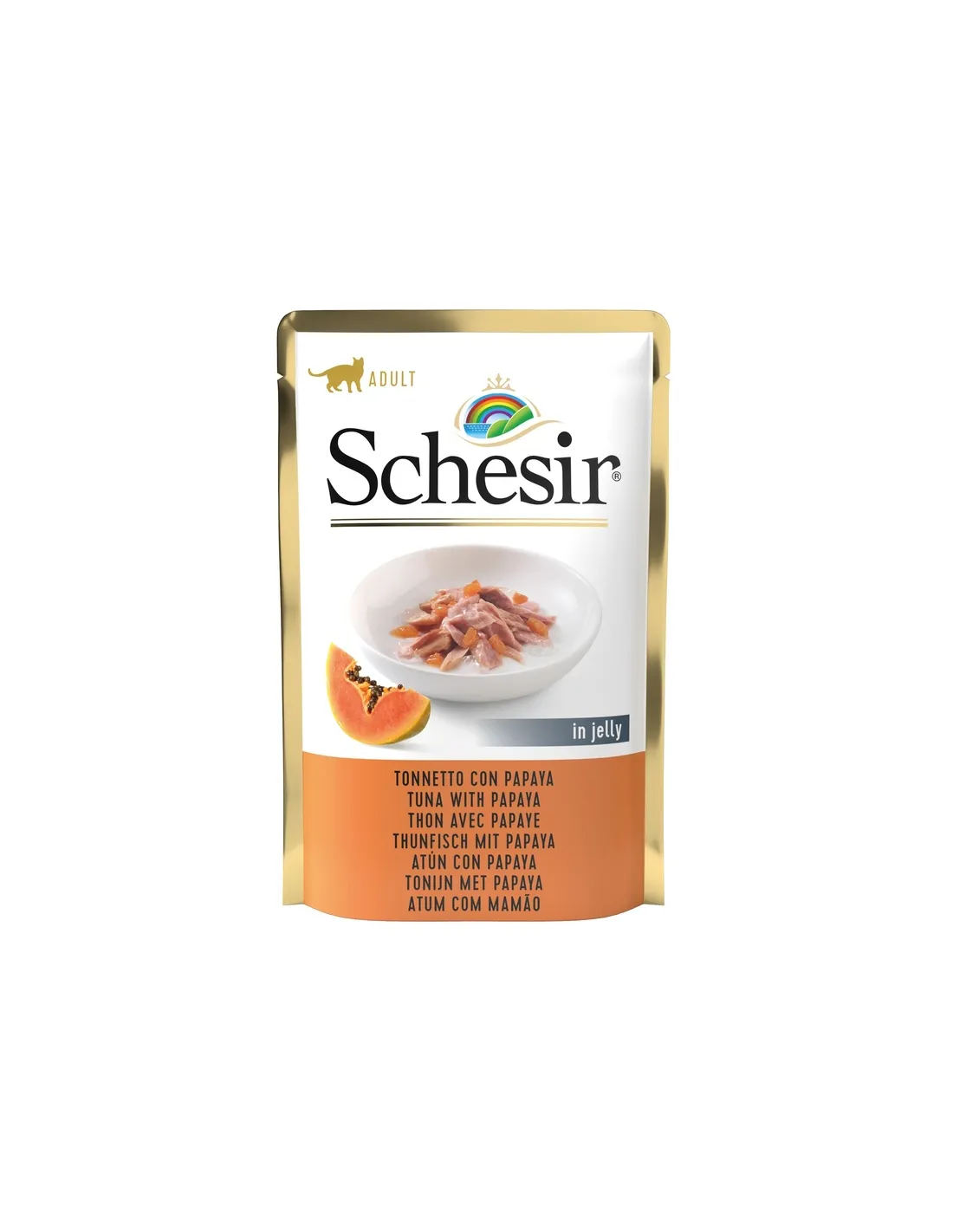 The composition of Schesir Gatto Tonnetto e Papaya has been carefully studied to offer a complete and balanced food. Wild tuna, the main ingredient, is carefully selected and steamed to preserve its nutritional and organoleptic qualities. Papaya, in addition to giving an exotic taste, provides vitamins and minerals useful for the cat's health. Rice is included as a source of easily digestible carbohydrates, while gelatin contributes to the water intake and makes the product particularly palatable.
