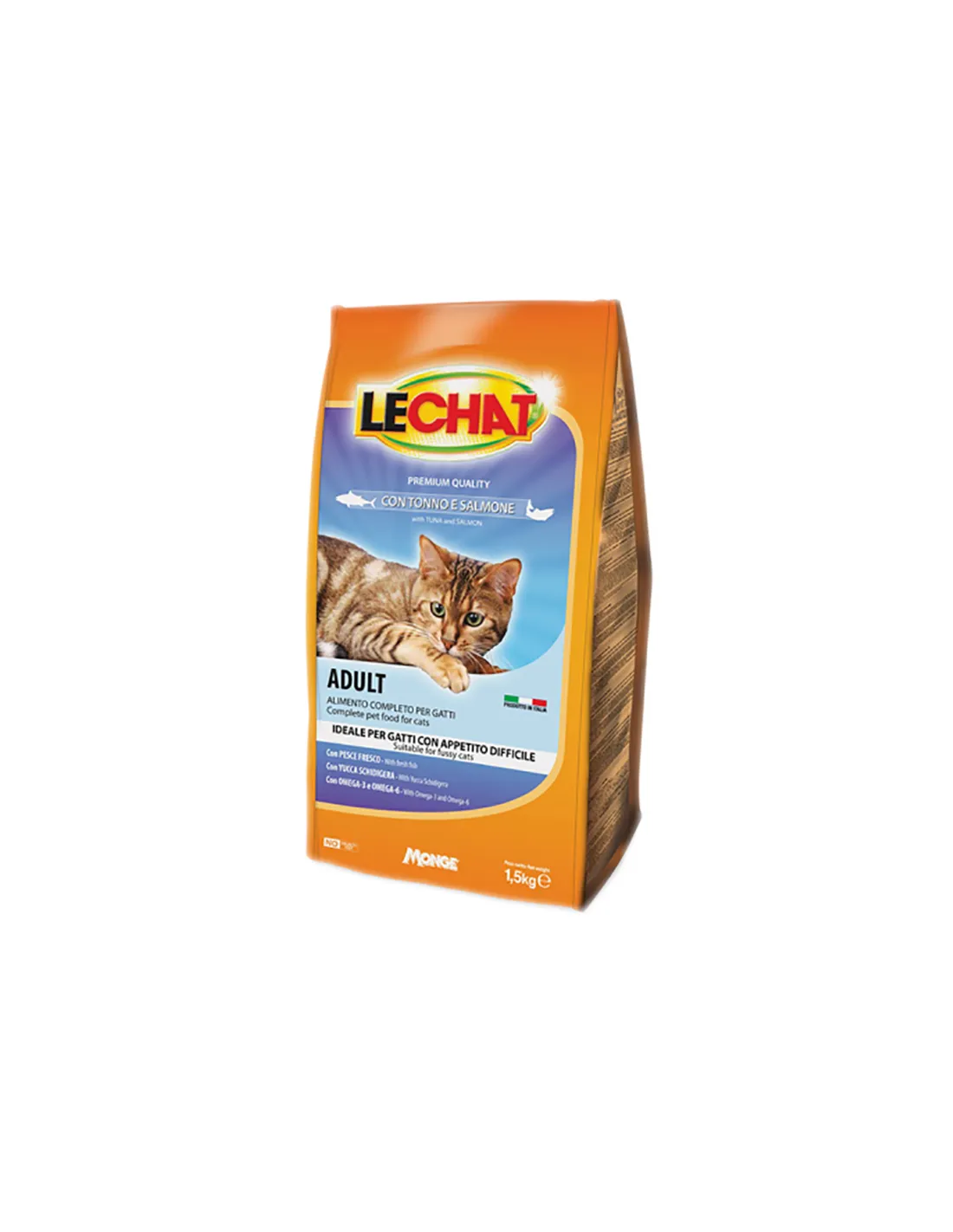 LeChat Croquettes are formulated with first choice tuna and salmon, guaranteeing an optimal protein intake. The ingredients also include extruded whole grains for better digestibility, essential fatty acids, Taurine, Vitamin A, M.O.S., F.O.S., Yucca Schidigera extract, as well as a balanced supply of minerals such as calcium and phosphorus for the general well-being of the cat.