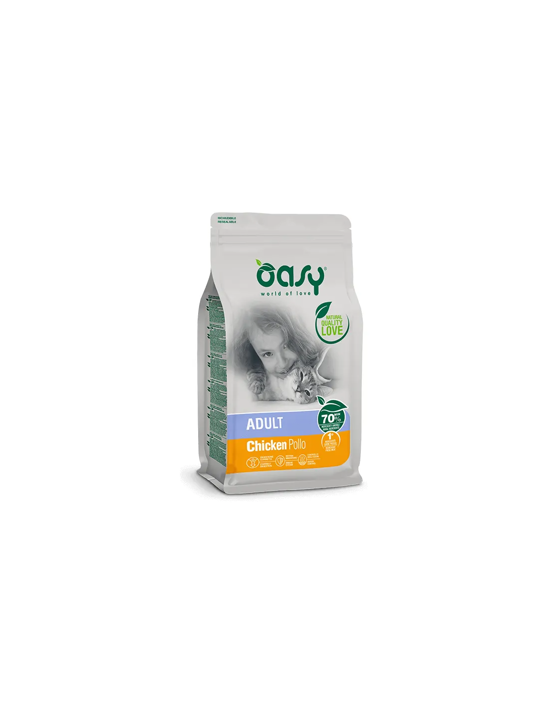 Made with high quality ingredients, Oasy Cat Adult Chicken guarantees an optimal intake of proteins, vitamins and minerals. The presence of chicken, as the first ingredient, provides a source of high-quality protein that helps maintain your cat's lean muscle mass.