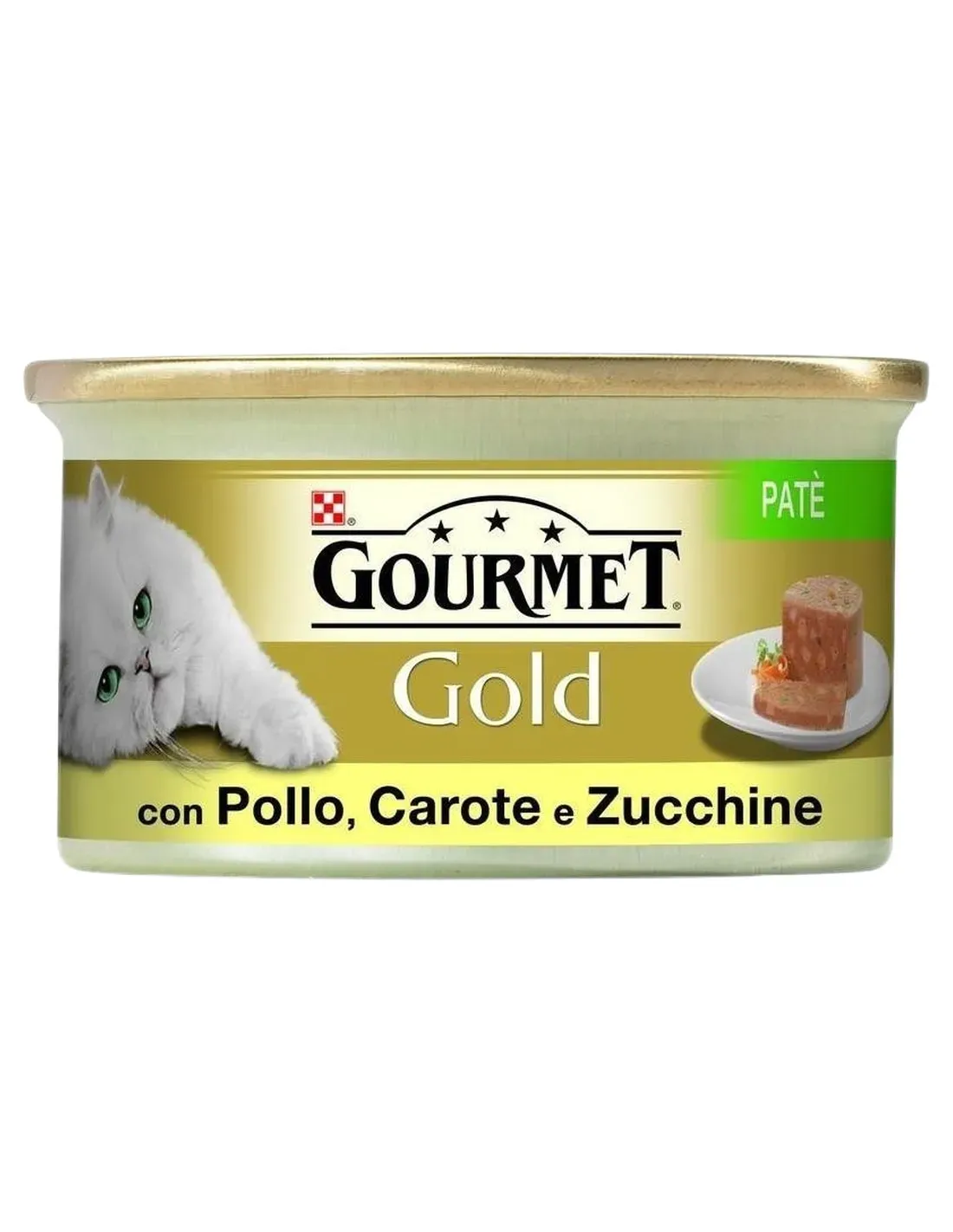 Gourmet gold pate with chicken, carrots and courgettes 85 g, the pleasure of choosing a different recipe every day among many very tasty ones. Only quality ingredientsto create a wonderful collection of delicate flavours.Every day, offer him a different moment of taste at each meal, to spoil his sophisticated palate.
