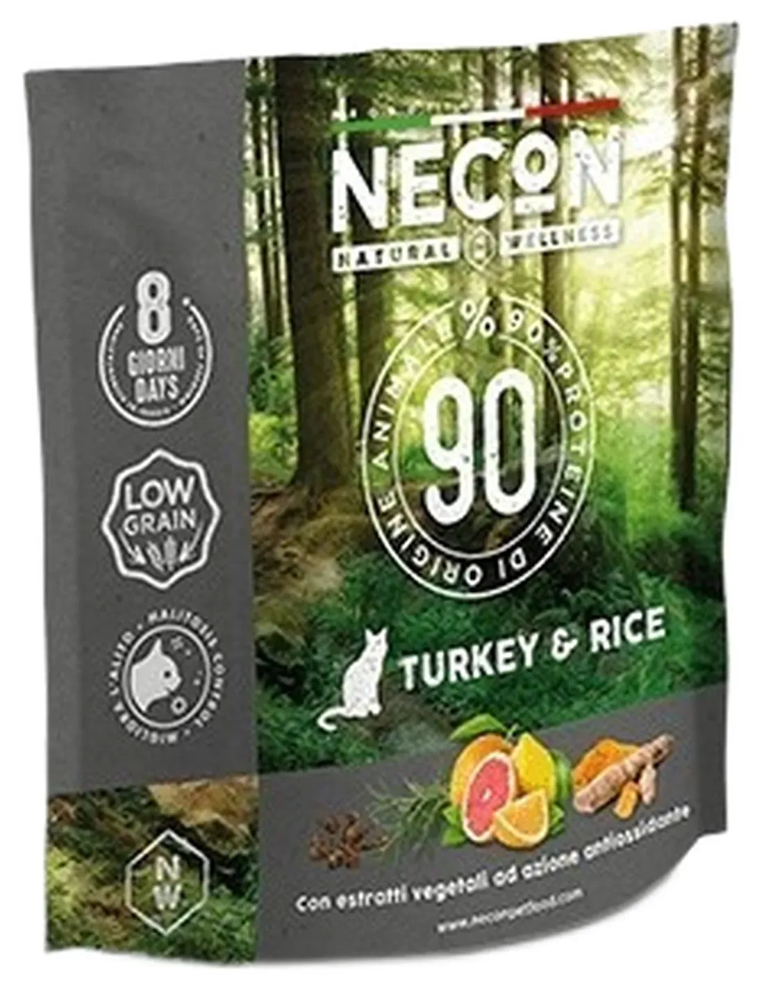NW Adult Turkey & rice is a superpremium low grain food formulated for adult cats with 27.5% turkey in the formula. Its formula rich in turkey guarantees that 90% of the proteins present in the formula are of animal origin, ensuring a diet worthy of a carnivore like the cat. Turkey was chosen because it is a more mature meat, on average richer in proteins than chicken and is also a source of omega 3 essential fatty acids, important for the health of the skin and fur. To improve the well-being of our cats, the recipe has been integrated with Ascophyllum nodosum algae (able to counteract the formation of plaque and reduce bad breath) and with a pool of plant extracts with an antioxidant action to counteract free radicals.