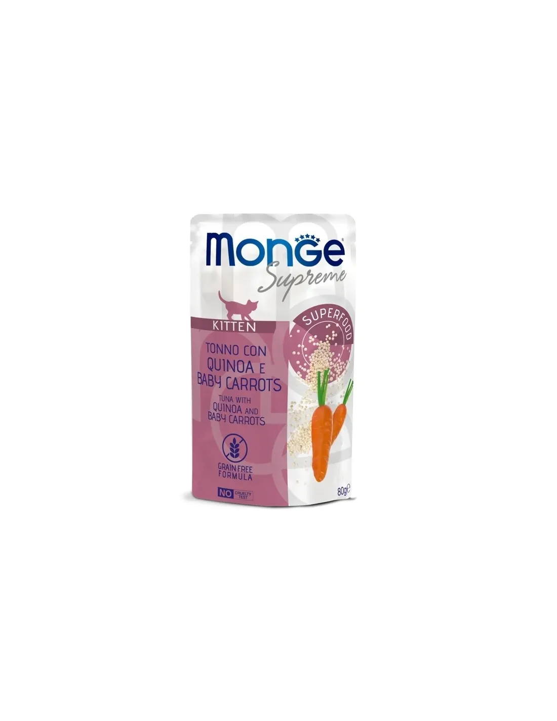It is a balanced food for growing kittens. Specially formulated to promote the regular growth of your kitten thanks to the presence of baby carrots, a natural source of vegetable fibers and antioxidants. The first ingredient is tuna from the ocean and the formulation is enriched with fructo-oligosaccharides (fos), prebiotics that support intestinal well-being. Refined ingredients such as quinoa, an energizing superfood particularly rich in antioxidants and minerals, help neutralize free radicals and support the daily vitality of our kittens.